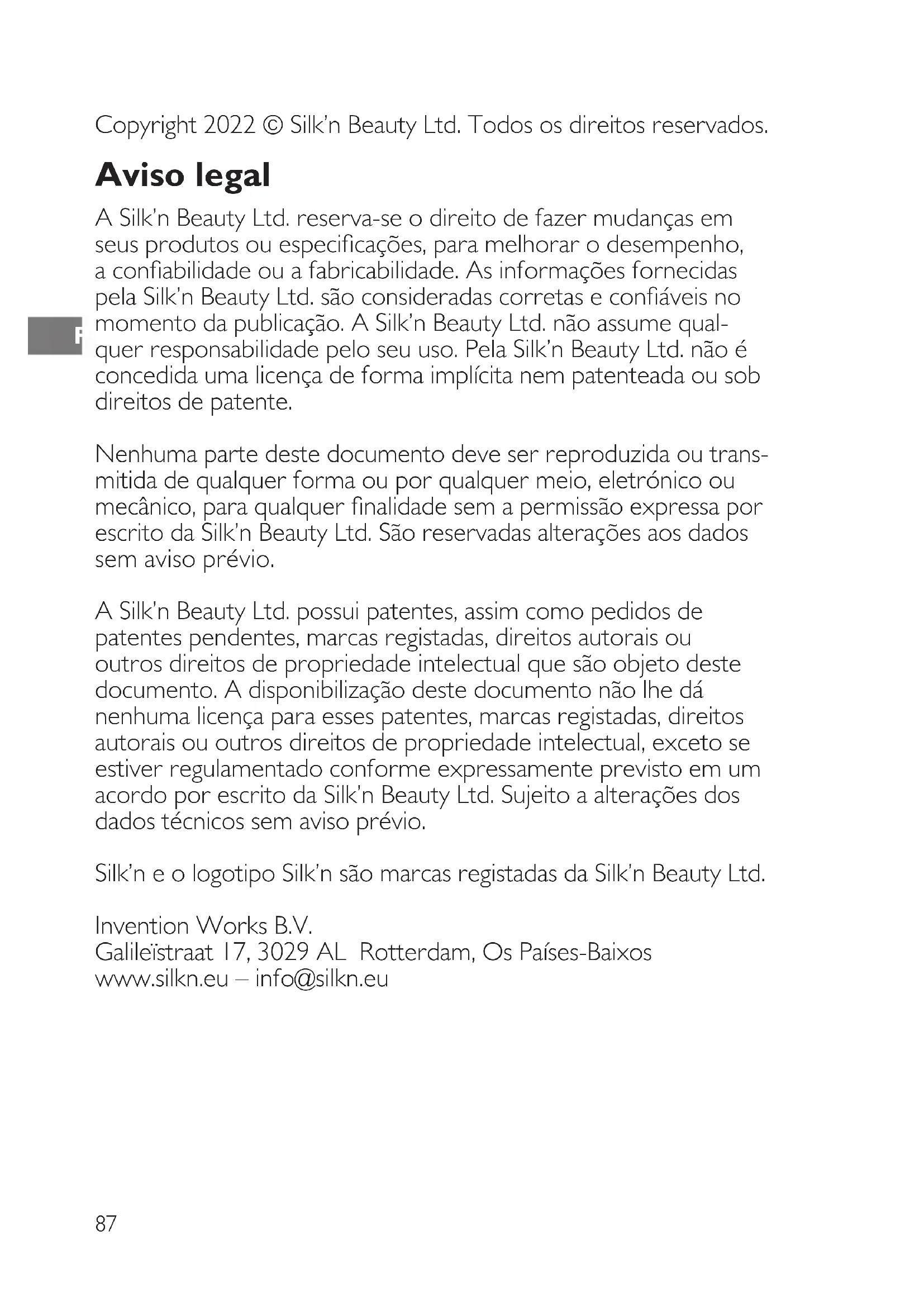 14 Atención al cliente Para obtener más información sobre los productos de Silk’n, visite la página web regional de Silk’n: www.silkn.eu. Si el dispositivo está estropeado, es defectuoso, debe repararse o si necesita nuestra asistencia, por favor, contacte con el centro de servicio de Silk’n más próximo. Este manual también puede descargarlo en formato PDF en: www.silkn.eu. Número de servicio: 900 823 302 Email: servicioalcliente@silkn.eu87 PTPT Copyright 2022 © Silk’n Beauty Ltd. Todos os direitos reservados. Aviso legal A Silk’n Beauty Ltd. reserva-se o direito de fazer mudanças em seus produtos ou especificações, para melhorar o desempenho, a confiabilidade ou a fabricabilidade. As informações fornecidas pela Silk’n Beauty Ltd. são consideradas corretas e confiáveis no momento da publicação. A Silk’n Beauty Ltd. não assume qual- quer responsabilidade pelo seu uso. Pela Silk’n Beauty Ltd. não é concedida uma licença de forma implícita nem patenteada ou sob direitos de patente. Nenhuma parte deste documento deve ser reproduzida ou trans- mitida de qualquer forma ou por qualquer meio, eletrónico ou mecânico, para qualquer finalidade sem a permissão expressa por escrito da Silk’n Beauty Ltd. São reservadas alterações aos dados sem aviso prévio. A Silk’n Beauty Ltd. possui patentes, assim como pedidos de patentes pendentes, marcas registadas, direitos autorais ou outros direitos de propriedade intelectual que são objeto deste documento. A disponibilização deste documento não lhe dá nenhuma licença para esses patentes, marcas registadas, direitos autorais ou outros direitos de propriedade intelectual, exceto se estiver regulamentado conforme expressamente previsto em um acordo por escrito da Silk’n Beauty Ltd. Sujeito a alterações dos dados técnicos sem aviso prévio. Silk’n e o logotipo Silk’n são marcas registadas da Silk’n Beauty Ltd. Invention Works B.V. Galileïstraat 17, 3029 AL Rotterdam, Os Países-Baixos www.silkn.eu – info@silkn.eu88 PTPT Índice 1 Volume de fornecimento/peças do aparelho _ 89 2 Generalidades _____________________________ 89