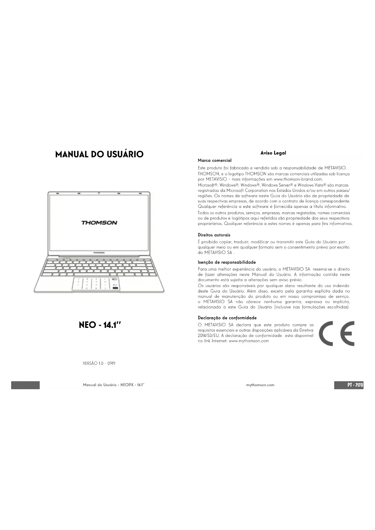 Aviso Legal Marca comercial Este produto foi fabricado e vendido sob a responsabilidade de METAVISIO. THOMSON, e o logotipo THOMSON são marcas comerciais utilizadas sob licença por METAVISIO - mais informações em www.thomson-brand.com. Microsoft®, Windows®, Windows®, Windows Server® e Windows Vista® são marcas registradas da Microsoft Corporation nos Estados Unidos e/ou em outros países/ regiões. Os nomes de software neste Guia do Usuário são de propriedade de suas respectivas empresas, de acordo com o contrato de licença correspondente. Qualquer referência a este software é fornecida apenas a título informativo. Todos os outros produtos, serviços, empresas, marcas registadas, nomes comerciais ou de produtos e logótipos aqui referidos são propriedade dos seus respectivos proprietários. Qualquer referência a estes nomes é apenas para ns informativos. Direitos autorais É proibido copiar, traduzir, modicar ou transmitir este Guia do Usuário por qualquer meio ou em qualquer formato sem o consentimento prévio por escrito do METAVISIO SA . Isenção de responsabilidade Para uma melhor experiência do usuário, o METAVISIO SA reserva-se o direito de fazer alterações neste Manual do Usuário. A informação contida neste documento está sujeita a alterações sem aviso prévio. Os usuários são responsáveis por qualquer dano resultante do uso indevido deste Guia do Usuário. Além disso, exceto pela garantia explícita dada no manual de manutenção do produto ou em nosso compromisso de serviço, o METAVISIO SA não oferece nenhuma garantia, expressa ou implícita, relacionada a este Guia do Usuário (inclusive nas formulações escolhidas). Declaração de conformidade O METAVISIO SA declara que este produto cumpre os requisitos essenciais e outras disposições aplicáveis da Diretiva 2014/53/EU. A declaração de conformidade esta disponível no link Internet: www.mythomson.comPT - 7372 - PT Manual do Usuário - NEOPX - 14.1’’ mythomson.com - Instruções de segurança importantes - Esta unidade deve ser utilizada num ambiente com uma temperatura ambiente entre 5°C (41°F) e 35°C (95°F). Não exponha a unidade à chuva ou humidade e mantenha-a afastada de líquidos. Em caso de salpicos de água ou outro líquido na unidade, desligue-a imediatamente e aguarde até que esteja completamente seca antes de a ligar novamente. Não exponha o aparelho diretamente à radiação solar Não utilize solventes fortes, detergentes líquidos ou outros produtos químicos sobre ou perto da superfície da unidade para evitar a corrosão ou deterioração da superfície da unidade. Não exponha a máquina a ambientes poeirentos. Não utilize a unidade durante uma fuga de gás. Não exponha o dispositivo a campos magnéticos ou elétricos fortes. Você pode operar o dispositivo através de detectores de raios X do aeroporto. No entanto, recomenda-se que não passe o seu dispositivo através dos portais de detecção magnética nem o exponha a detetores portáteis. Não coloque quaisquer objetos sobre o dispositivo. Não coloque a unidade sobre uma superfície irregular ou instável. Certique-se de que protege a unidade de quedas ou qualquer outro impacto que a possa danicar. Não deixe o aparelho sobre ou carregado no seu colo ou em qualquer outra parte do seu corpo para evitar qualquer risco de lesões relacionadas com o calor. Desligue o aparelho antes de o transportar ou de o cobrir com um material que não permita uma circulação de ar óptima. Não utilize cabos de alimentação, acessórios ou outros dispositivos danicados com o seu aparelho. Recomendamos a utilização exclusiva dos acessórios (alimentação eléctrica, cabos, etc.) fornecidos com o aparelho. Utilize apenas baterias originais. A substituição da bateria por uma bateria incorreta pode causar risco de explosão. Não desmonte, modique ou repare a unidade por conta própria, pois isso pode anular a garantia. Por favor, faça cópias de segurança do seu conteúdo importante regularmente para evitar a perda de dados. A nossa empresa não aceita qualquer responsabilidade pela perda ou remoção de itens contidos no dispositivo devido à utilização inadequada do hardware ou software, falta de manutenção ou qualquer outro evento acidental. Este produto foi concebido para permitir a reciclagem adequada de peças e componentes. O símbolo que representa um caixote do lixo com uma cruz indica que o dispositivo não deve ser eliminado juntamente com o lixo municipal. Consulte os regulamentos locais para descarte de dispositivos eletrônicos. O símbolo que representa um caixote do lixo com uma cruz indica que a bateria não deve ser eliminada juntamente com os resíduos municipais. Consulte os regulamentos locais para a eliminação da bateria. Para evitar possíveis danos auditivos, não ouvir níveis de som elevados durante longos períodos de tempo.PT - 7574 - PT Manual do Usuário - NEOPX - 14.1’’ mythomson.com - Apresentação do dispositivo - Vista frontal Nota : A apresentação do dispositivo e alguns recursos podem variar de acordo com o país, modelo ou versão.