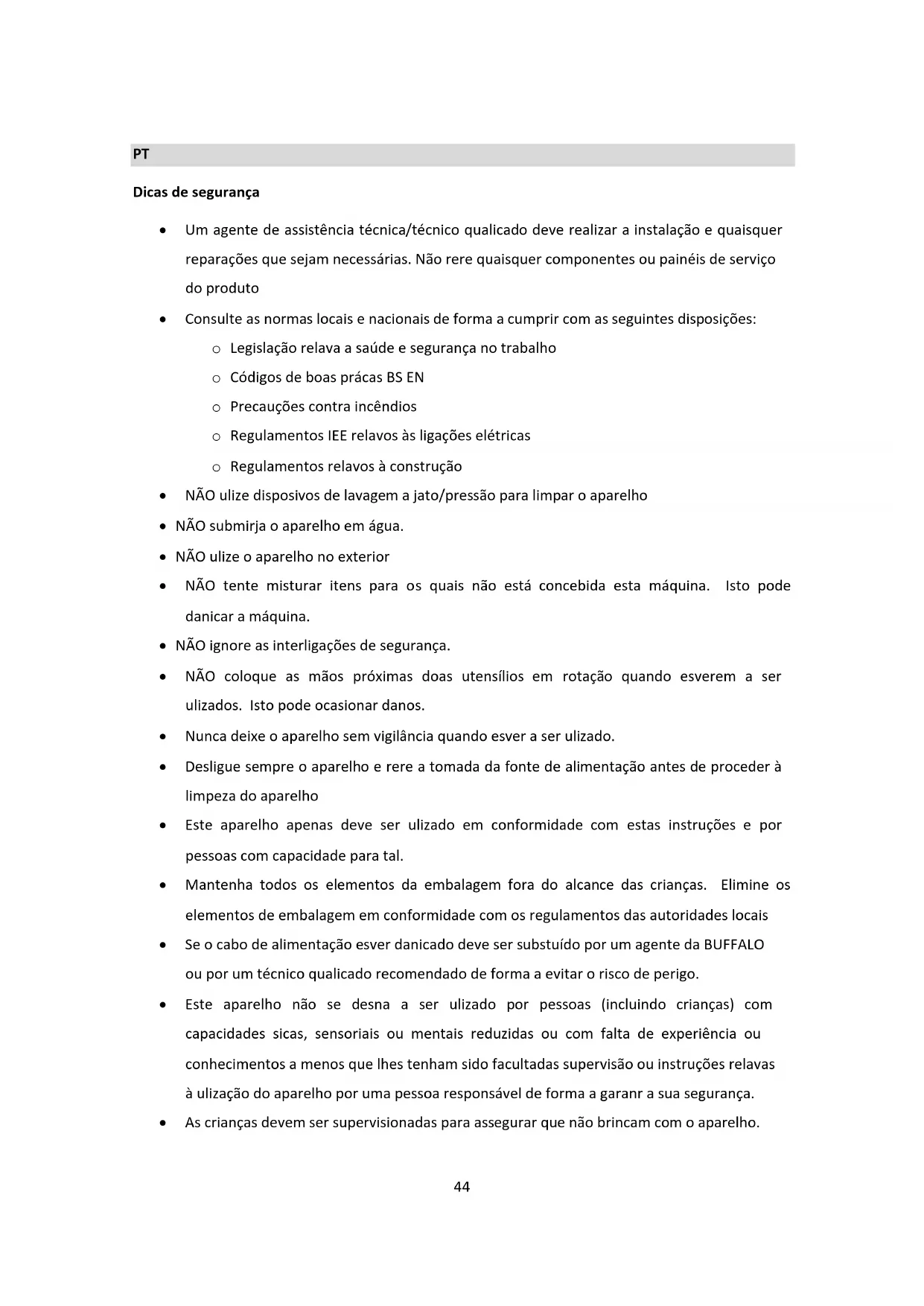 Dicas de segurança Um agente de assistência técnica/técnico qualificado deve realizar a instalação e quaisquer reparações que sejam necessárias. Não retire quaisquer componentes ou painéis de serviço do produto Consulte as normas locais e nacionais de forma a cumprir com as seguintes disposições: o Legislação relativa a saúde e segurança no trabalho o Códigos de boas práticas BS EN o Precauções contra incêndios o Regulamentos IEE relativos às ligações elétricas o Regulamentos relativos à construção NÃO utilize dispositivos de lavagem a jato/pressão para limpar o aparelho NÃO submirja o aparelho em água. NÃO utilize o aparelho no exterior NÃO tente misturar itens para os quais não está concebida esta máquina. Isto pode danificar a máquina. NÃO ignore as interligações de segurança. NÃO coloque as mãos próximas doas utensílios em rotação quando estiverem a ser utilizados. Isto pode ocasionar danos. Nunca deixe o aparelho sem vigilância quando estiver a ser utilizado. Desligue sempre o aparelho e retire a tomada da fonte de alimentação antes de proceder à limpeza do aparelho Este aparelho apenas deve ser utilizado em conformidade com estas instruções e por pessoas com capacidade para tal. Mantenha todos os elementos da embalagem fora do alcance das crianças. Elimine os elementos de embalagem em conformidade com os regulamentos das autoridades locais Se o cabo de alimentação estiver danificado deve ser substituído por um agente da BUFFALO ou por um técnico qualificado recomendado de forma a evitar o risco de perigo. Este aparelho não se destina a ser utilizado por pessoas (incluindo crianças) com capacidades físicas, sensoriais ou mentais reduzidas ou com falta de experiência ou conhecimentos a menos que lhes tenham sido facultadas supervisão ou instruções relativas à utilização do aparelho por uma pessoa responsável de forma a garantir a sua segurança. As crianças devem ser supervisionadas para assegurar que não brincam com o aparelho.45