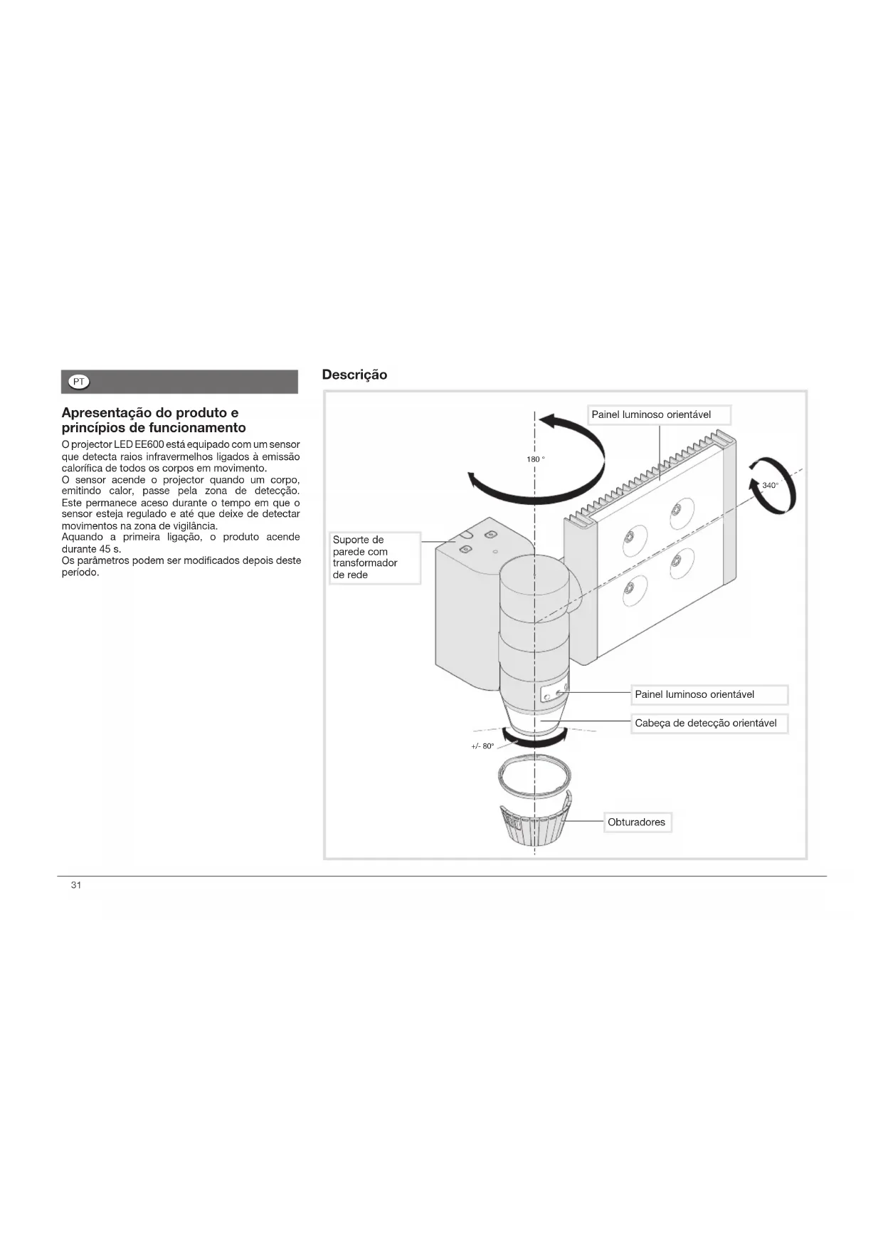 r180 ° 200° 180° 340° +/- 80° Apresentação do produto e princípios de funcionamento O projector LED EE600 está equipado com um sensor que detecta raios infravermelhos ligados à emissão caloríca de todos os corpos em movimento. O sensor acende o projector quando um corpo, emitindo calor, passe pela zona de detecção. Este permanece aceso durante o tempo em que o sensor esteja regulado e até que deixe de detectar movimentos na zona de vigilância. Aquando a primeira ligação, o produto acende durante 45 s. Os parâmetros podem ser modicados depois deste período. Painel luminoso orientável Suporte de parede com transformador de rede Cabeça de detecção orientável Descrição Painel luminoso orientável Obturadores