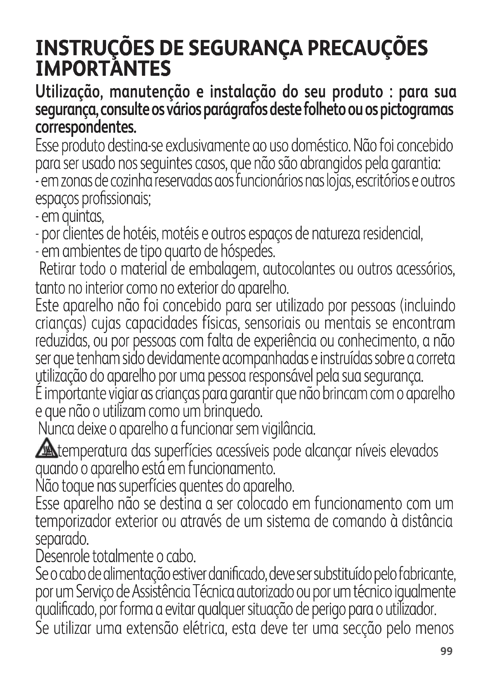 - GUIA DE CONFEÇÃO (INCLUINDO MODO MANUAL) p.11399 INSTRUÇÕES DE SEGURANÇA PRECAUÇÕES IMPORTANTES Utilização, manutenção e instalação do seu produto : para sua segurança, consulte os vários parágrafos deste folheto ou os pictogramas correspondentes. Esse produto destina-se exclusivamente ao uso doméstico. Não foi concebido para ser usado nos seguintes casos, que não são abrangidos pela garantia: - em zonas de cozinha reservadas aos funcionários nas lojas, escritórios e outros espaços profissionais; - em quintas, - por clientes de hotéis, motéis e outros espaços de natureza residencial, - em ambientes de tipo quarto de hóspedes. Retirar todo o material de embalagem, autocolantes ou outros acessórios, tanto no interior como no exterior do aparelho. Este aparelho não foi concebido para ser utilizado por pessoas (incluindo crianças) cujas capacidades físicas, sensoriais ou mentais se encontram reduzidas, ou por pessoas com falta de experiência ou conhecimento, a não ser que tenham sido devidamente acompanhadas e instruídas sobre a correta utilização do aparelho por uma pessoa responsável pela sua segurança. É importante vigiar as crianças para garantir que não brincam com o aparelho e que não o utilizam como um brinquedo. Nunca deixe o aparelho a funcionar sem vigilância. A temperatura das superfícies acessíveis pode alcançar níveis elevados quando o aparelho está em funcionamento. Não toque nas superfícies quentes do aparelho. Esse aparelho não se destina a ser colocado em funcionamento com um temporizador exterior ou através de um sistema de comando à distância separado. Desenrole totalmente o cabo. Se o cabo de alimentação estiver danificado, deve ser substituído pelo fabricante, por um Serviço de Assistência Técnica autorizado ou por um técnico igualmente qualificado, por forma a evitar qualquer situação de perigo para o utilizador. Se utilizar uma extensão elétrica, esta deve ter uma secção pelo menos100 equivalente, e ter uma tomada com ligação de terra incorporada. Tome as devidas precauções para que ninguém tropece. O aparelho apenas deve ser ligado a uma tomada com ligação à terra incorporada. Certifique-se de que a instalação elétrica é compatível com a potência e a tensão indicadas por baixo do aparelho. Este aparelho não pode ser mergulhado em líquidos. Nunca mergulhe o aparelho nem o cabo em água. O aparelho pode ser utilizado por crianças a partir dos 8 anos ou mais e por pessoas com capacidades físicas, sensoriais e mentais reduzidas ou falta de experiência e conhecimentos, desde que tenham sido devidamente acompanhadas e instruídas sobre a utilização do aparelho em segurança e que compreendam os perigos envolvidos. A limpeza e a manutenção do mesmo por parte do utilizador não devem ser realizadas por crianças, a não ser que tenham mais de 8 anos e sejam supervisionadas. Manter o aparelho e o cabo de alimentação fora do alcance de crianças com menos de 8 anos. ATENÇÃO : Não aqueça nem preaqueça o grelhador sem as duas placas colocadas no interior. O que pode fazer