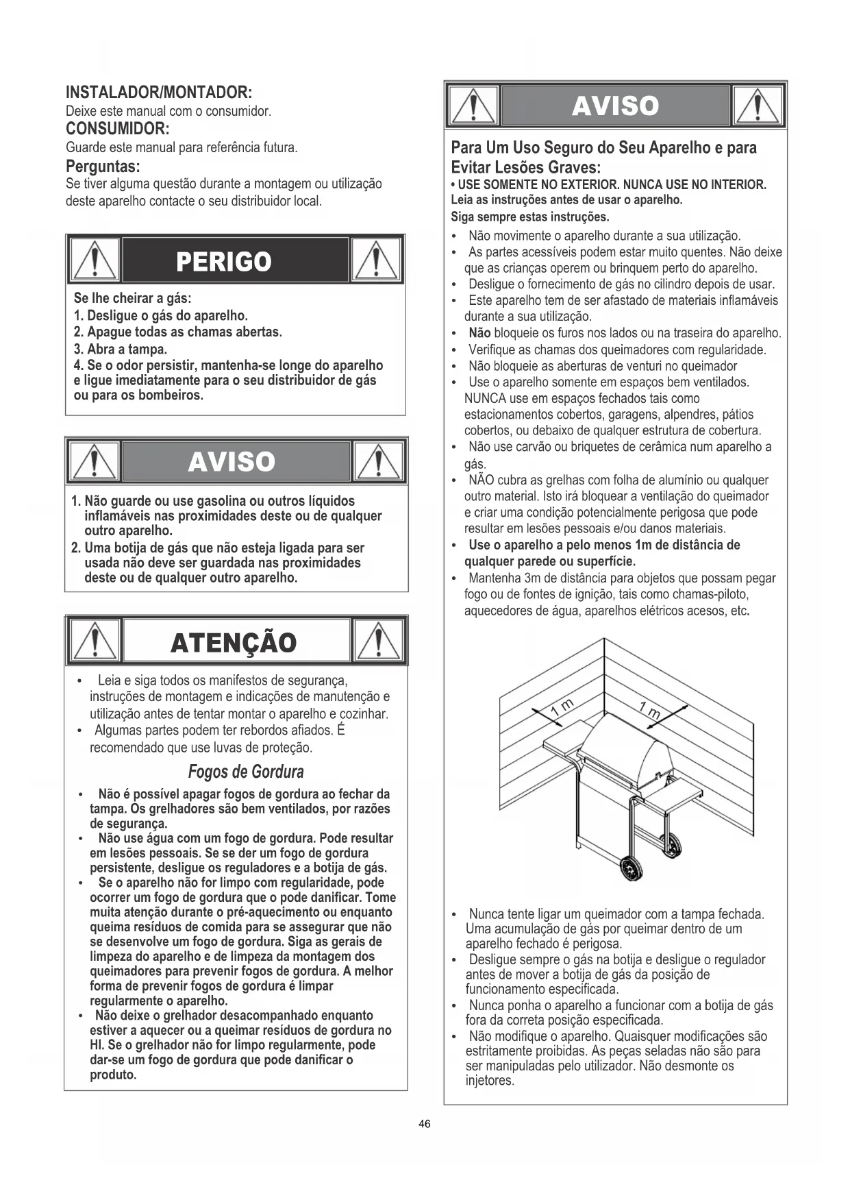 - USE SOMENTE NO EXTERIOR. NUNCA USE NO INTERIOR.Leia as instruções antes de usar o aparelho.Siga sempre estas instruções.Ÿ Não movimente o aparelho durante a sua utilização.Ÿ As partes acessíveis podem estar muito quentes. Não deixe que as crianças operem ou brinquem perto do aparelho. Ÿ Desligue o fornecimento de gás no cilindro depois de usar.Ÿ Este aparelho tem de ser afastado de materiais inflamáveis durante a sua utilização. Ÿ Não bloqueie os furos nos lados ou na traseira do aparelho.Ÿ Verifique as chamas dos queimadores com regularidade.Ÿ Não bloqueie as aberturas de venturi no queimadorŸ Use o aparelho somente em espaços bem ventilados. NUNCA use em espaços fechados tais como estacionamentos cobertos, garagens, alpendres, pátios cobertos, ou debaixo de qualquer estrutura de cobertura. Ÿ Não use carvão ou briquetes de cerâmica num aparelho a gás. Ÿ NÃO cubra as grelhas com folha de alumínio ou qualquer outro material. Isto irá bloquear a ventilação do queimador e criar uma condição potencialmente perigosa que pode resultar em lesões pessoais e/ou danos materiais. Ÿ Use o aparelho a pelo menos 1m de distância de qualquer parede ou superfície. Ÿ Mantenha 3m de distância para objetos que possam pegar fogo ou de fontes de ignição, tais como chamas-piloto, aquecedores de água, aparelhos elétricos acesos, etc. Ÿ Nunca tente ligar um queimador com a tampa fechada. Uma acumulação de gás por queimar dentro de um aparelho fechado é perigosa. Ÿ Desligue sempre o gás na botija e desligue o regulador antes de mover a botija de gás da posição de funcionamento especificada. Ÿ Nunca ponha o aparelho a funcionar com a botija de gás fora da correta posição especificada. Ÿ Não modifique o aparelho. Quaisquer modificações são estritamente proibidas. As peças seladas não são para ser manipuladas pelo utilizador. Não desmonte os injetores. 1 m 1 m 46Posicionamento da Botija Uma botija de 6kg ou menos pode ser posicionada no chão, debaixo da prateleira lateral, ou dentro do aparelho no lugar designado. Botijas maiores apenas devem ser posicionadas debaixo da prateleira lateral ou por detrás do grelhador. As botijas colocadas dentro do aparelho devem ter um diâmetro máximo de 340mm e a altura máxima de 400mm. As botijas colocadas no chão não devem ser postas por baixo do fogareiro. Requerimentos do Redutor Deve ser utilizado um redutor com este aparelho. Use apenas o redutor de gás fornecido com o seu grelhador. Se não lhe for fornecido um redutor, então use um certificado pela norma EN16129 (Caudal máx. 1,5kg/h) e aprovada para o seu país e o gás especificados nos Dados Técnicos. Requerimentos da Mangueira Use apenas mangueiras aprovadas, que são certificadas pela norma EN padrão apropriada e que não excedem os 1,5m de comprimento. Na Finlândia, o comprimento da mangueira não deve exceder os 1,2m. Antes de cada utilização, verifique se as suas mangueiras estão cortadas ou gastas. Assegure-se de que a mangueira não está dobrada. Assegure-se de que, quando esteja ligada, a mangueira não toca em nenhuma superfície quente. Substitua as mangueiras danificadas antes de usar o aparelho. Substitua a mangueira seguindo os requerimentos nacionais. Dicas de Segurança Ÿ Antes de abrir a válvula da botija de gás, verifique a estanquicidade do regulador. Ÿ Quando o aparelho não esteja a ser usado, desligue todos os botões de controlo e o gás. Ÿ Utilize utensílios de grelhador com pegas longas e luvas de forno para evitar queimaduras e salpicos. Use luvas de proteção quando estiver a manipular componentes quentes. Ÿ A carga máxima do fogareiro, se equipada, e da prateleira lateral é de 4,5 Kg. O diâmetro mínimo da superfície de cozedura é de 200mm e o máximo de 260mm. NOTA: O seu grelhador pode NÃO estar equipado com um Fogareiro! Ÿ O copo de gordura (se equipado) deve ser inserido no aparelho e esvaziado depois de cada utilização. Não retire o copo de gordura até que o aparelho tenha arrefecido completamente. Ÿ Tenha muito cuidado quando abrir a tampa, uma vez que pode libertar-se vapor quente. Ÿ Tenha muito cuidado quando crianças, idosos ou animais de estimação estejam próximos. Se notar que gordura ou qualquer outro material quente está a pingar do aparelho para a válvula, mangueira ou regulador, desligue imediatamente o fornecimento de gás. Determine a causa, corrija-a, e depois limpe e inspecione a válvula, mangueira e regulador antes de prosseguir. Faça um teste de fugas. Ÿ Não guarde objetos ou materiais dentro da parte fechada do carrinho do aparelho que possam bloquear o fluxo de combustão de ar para a parte de baixo tanto do painel de controlo como da bacia da fornalha. Ÿ NÃO desligue ou troque o contentor de gás num raio de 3m de uma chama aberta ou outra fonte de ignição. AVISO Desligue os controlos e a botija de gás quando fora de uso Se a ignição NÃO ocorrer em 5 segundos, desligue os controlos do queimador, aguarde 5 minutos e repita o processo de ignição. Se o queimador não se acender com a válvula aberta, o gás continuará a fluir e pode acender-se acidentalmente, com risco de lesões. ATENÇÃO Acender com dispositivo de ignição