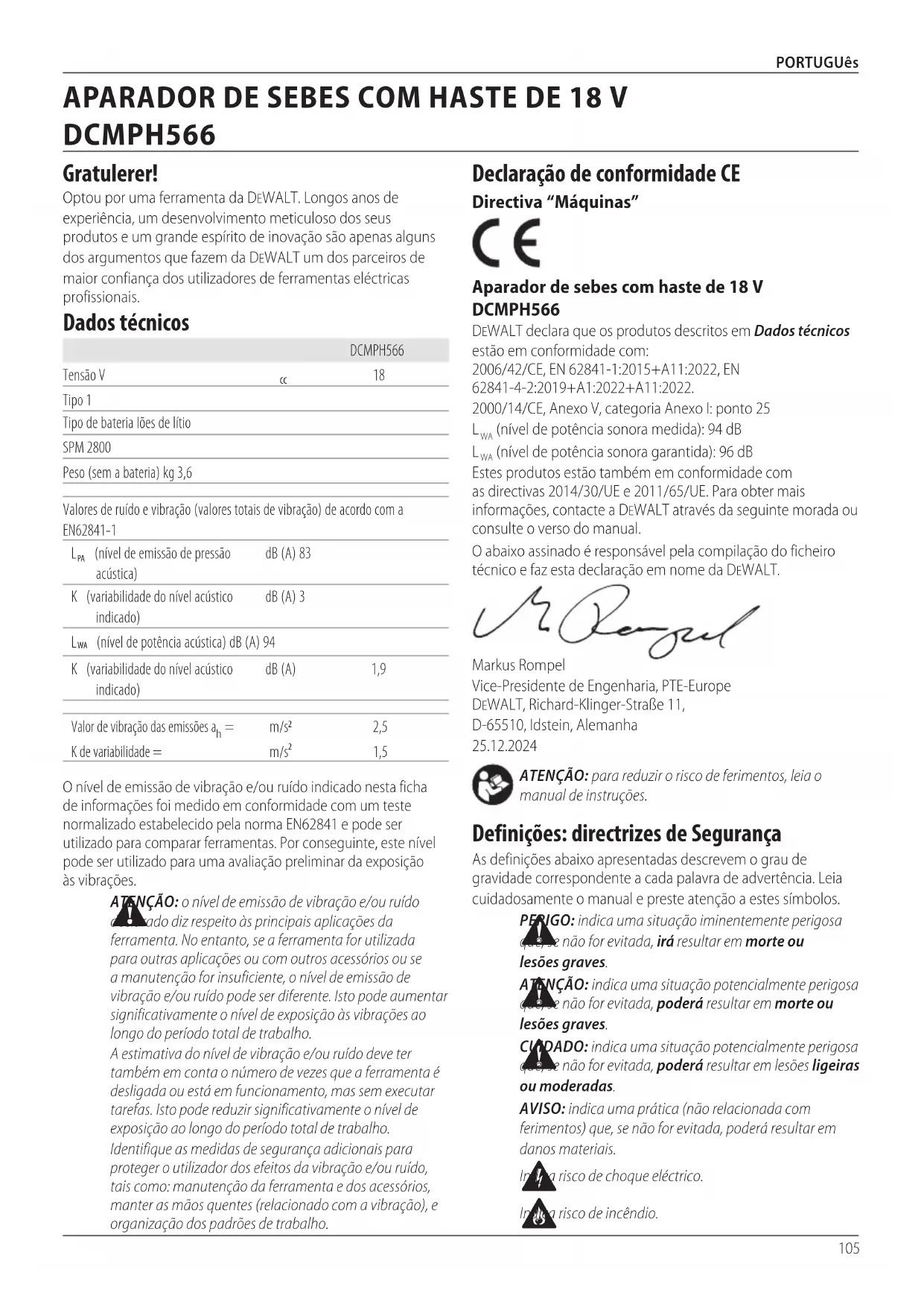 (nível de potência sonora garantida): 96 dB Estes produtos estão também em conformidade com as directivas 2014/30/UE e 2011/65/UE. Para obter mais informações, contacte a DeWALT através da seguinte morada ou consulte o verso do manual. O abaixo assinado é responsável pela compilação do ficheiro técnico e faz esta declaração em nome daDeWALT. Markus Rompel Vice-Presidente de Engenharia, PTE-Europe DeWALT, Richard-Klinger-Straße 11, D-65510, Idstein, Alemanha