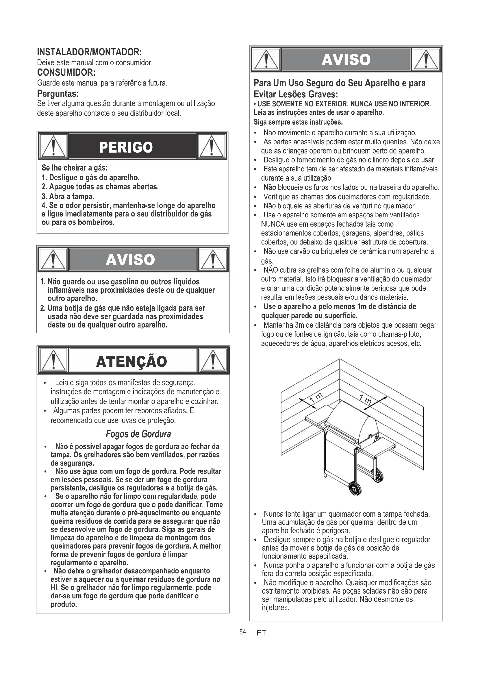 - USE SOMENTE NO EXTERIOR. NUNCA USE NO INTERIOR.Leia as instruções antes de usar o aparelho.Siga sempre estas instruções.Ÿ Não movimente o aparelho durante a sua utilização.Ÿ As partes acessíveis podem estar muito quentes. Não deixe que as crianças operem ou brinquem perto do aparelho. Ÿ Desligue o fornecimento de gás no cilindro depois de usar.Ÿ Este aparelho tem de ser afastado de materiais inflamáveis durante a sua utilização. Ÿ Não bloqueie os furos nos lados ou na traseira do aparelho.Ÿ Verifique as chamas dos queimadores com regularidade.Ÿ Não bloqueie as aberturas de venturi no queimadorŸ Use o aparelho somente em espaços bem ventilados. NUNCA use em espaços fechados tais como estacionamentos cobertos, garagens, alpendres, pátios cobertos, ou debaixo de qualquer estrutura de cobertura. Ÿ Não use carvão ou briquetes de cerâmica num aparelho a gás. Ÿ NÃO cubra as grelhas com folha de alumínio ou qualquer outro material. Isto irá bloquear a ventilação do queimador e criar uma condição potencialmente perigosa que pode resultar em lesões pessoais e/ou danos materiais. Ÿ Use o aparelho a pelo menos 1m de distância de qualquer parede ou superfície. Ÿ Mantenha 3m de distância para objetos que possam pegar fogo ou de fontes de ignição, tais como chamas-piloto, aquecedores de água, aparelhos elétricos acesos, etc. Ÿ Nunca tente ligar um queimador com a tampa fechada. Uma acumulação de gás por queimar dentro de um aparelho fechado é perigosa. Ÿ Desligue sempre o gás na botija e desligue o regulador antes de mover a botija de gás da posição de funcionamento especificada. Ÿ Nunca ponha o aparelho a funcionar com a botija de gás fora da correta posição especificada. Ÿ Não modifique o aparelho. Quaisquer modificações são estritamente proibidas. As peças seladas não são para ser manipuladas pelo utilizador. Não desmonte os injetores.