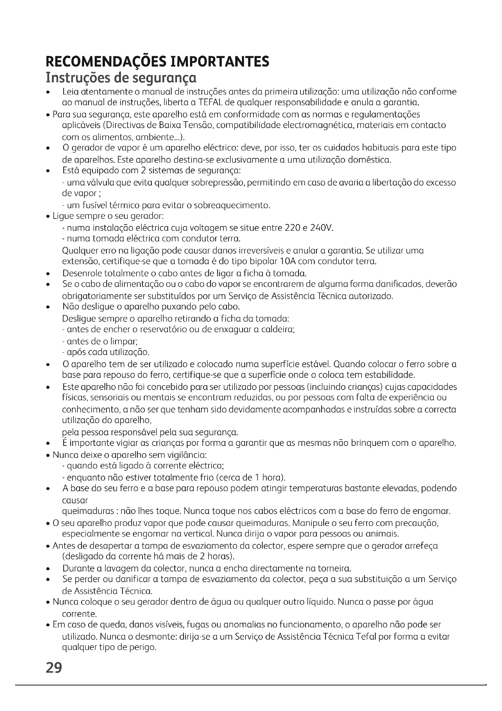 - Leia atentamente o manual de instruções antes da primeira utilização: uma utilização não conforme ao manual de instruções, liberta a TEFAL de qualquer responsabilidade e anula a garantia.