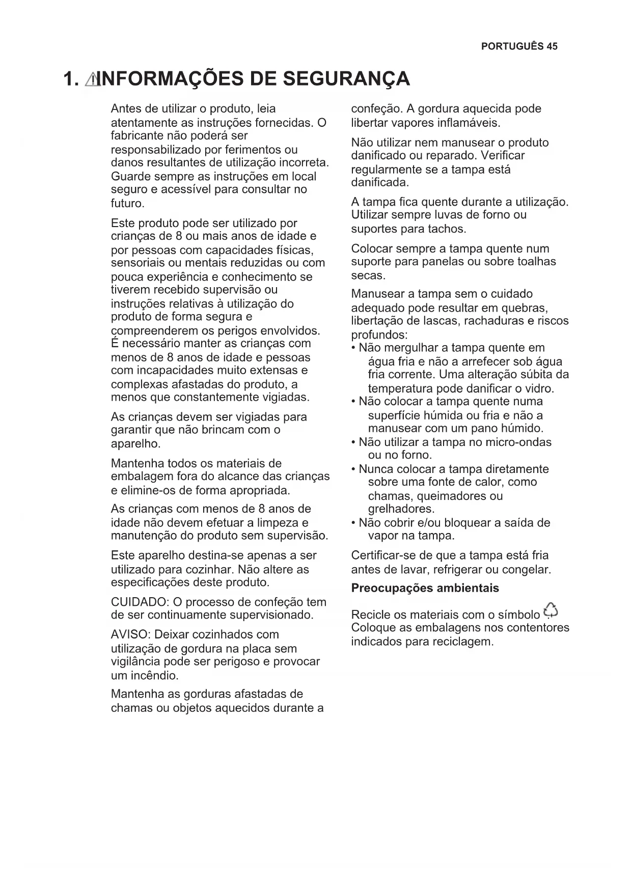 Antes de utilizar o produto, leia atentamente as instruções fornecidas. O fabricante não poderá ser responsabilizado por ferimentos ou danos resultantes de utilização incorreta. Guarde sempre as instruções em local seguro e acessível para consultar no futuro. Este produto pode ser utilizado por crianças de 8 ou mais anos de idade e por pessoas com capacidades físicas, sensoriais ou mentais reduzidas ou com pouca experiência e conhecimento se tiverem recebido supervisão ou instruções relativas à utilização do produto de forma segura e compreenderem os perigos envolvidos. É necessário manter as crianças com menos de 8 anos de idade e pessoas com incapacidades muito extensas e complexas afastadas do produto, a menos que constantemente vigiadas. As crianças devem ser vigiadas para garantir que não brincam com o aparelho. Mantenha todos os materiais de embalagem fora do alcance das crianças e elimine-os de forma apropriada. As crianças com menos de 8 anos de idade não devem efetuar a limpeza e manutenção do produto sem supervisão. Este aparelho destina-se apenas a ser utilizado para cozinhar. Não altere as especificações deste produto. CUIDADO: O processo de confeção tem de ser continuamente supervisionado. AVISO: Deixar cozinhados com utilização de gordura na placa sem vigilância pode ser perigoso e provocar um incêndio. Mantenha as gorduras afastadas de chamas ou objetos aquecidos durante a confeção. A gordura aquecida pode libertar vapores inflamáveis. Não utilizar nem manusear o produto danificado ou reparado. Verificar regularmente se a tampa está danificada. A tampa fica quente durante a utilização. Utilizar sempre luvas de forno ou suportes para tachos. Colocar sempre a tampa quente num suporte para panelas ou sobre toalhas secas. Manusear a tampa sem o cuidado adequado pode resultar em quebras, libertação de lascas, rachaduras e riscos profundos: