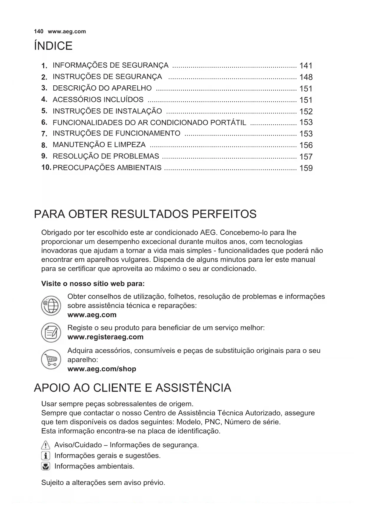 Obrigado por ter escolhido este ar condicionado AEG. Concebemo-lo para lhe proporcionar um desempenho excecional durante muitos anos, com tecnologias inovadoras que ajudam a tornar a vida mais simples - funcionalidades que poderá não encontrar em aparelhos vulgares. Dispenda de alguns minutos para ler este manual para se certificar que aproveita ao máximo o seu ar condicionado. Usar sempre peças sobressalentes de origem. Sempre que contactar o nosso Centro de Assistência Técnica Autorizado, assegure que tem disponíveis os dados seguintes: Modelo, PNC, Número de série. Esta informação encontra-se na placa de identificação. Visite o nosso sítio web para: Obter conselhos de utilização, folhetos, resolução de problemas e informações sobre assistência técnica e reparações: www.aeg.com Registe o seu produto para beneficiar de um serviço melhor: www.registeraeg.com Adquira acessórios, consumíveis e peças de substituição originais para o seu aparelho: www.aeg.com/shop