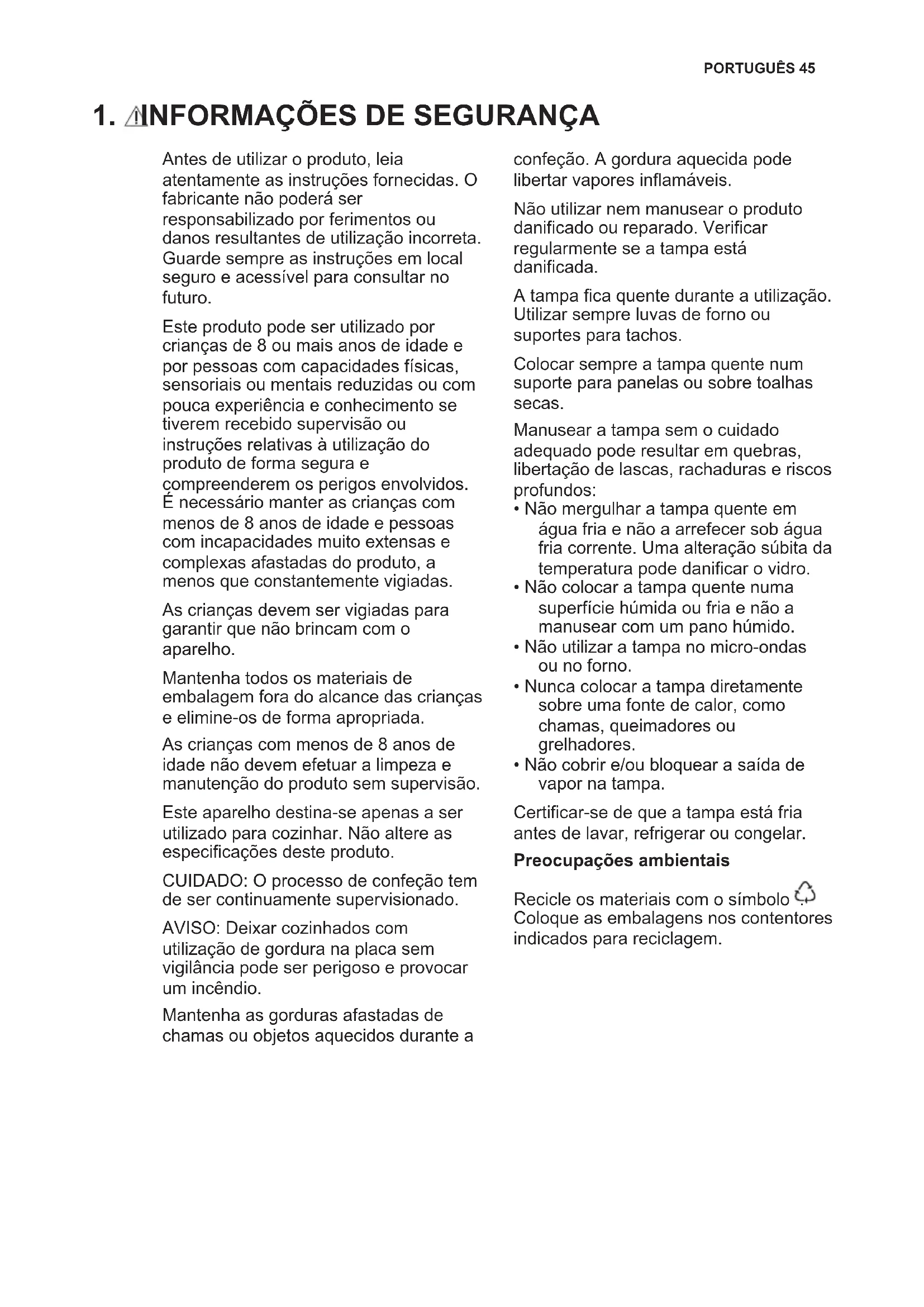 Antes de utilizar o produto, leia atentamente as instruções fornecidas. O fabricante não poderá ser responsabilizado por ferimentos ou danos resultantes de utilização incorreta. Guarde sempre as instruções em local seguro e acessível para consultar no futuro. Este produto pode ser utilizado por crianças de 8 ou mais anos de idade e por pessoas com capacidades físicas, sensoriais ou mentais reduzidas ou com pouca experiência e conhecimento se tiverem recebido supervisão ou instruções relativas à utilização do produto de forma segura e compreenderem os perigos envolvidos. É necessário manter as crianças com menos de 8 anos de idade e pessoas com incapacidades muito extensas e complexas afastadas do produto, a menos que constantemente vigiadas. As crianças devem ser vigiadas para garantir que não brincam com o aparelho. Mantenha todos os materiais de embalagem fora do alcance das crianças e elimine-os de forma apropriada. As crianças com menos de 8 anos de idade não devem efetuar a limpeza e manutenção do produto sem supervisão. Este aparelho destina-se apenas a ser utilizado para cozinhar. Não altere as especificações deste produto. CUIDADO: O processo de confeção tem de ser continuamente supervisionado. AVISO: Deixar cozinhados com utilização de gordura na placa sem vigilância pode ser perigoso e provocar um incêndio. Mantenha as gorduras afastadas de chamas ou objetos aquecidos durante a confeção. A gordura aquecida pode libertar vapores inflamáveis. Não utilizar nem manusear o produto danificado ou reparado. Verificar regularmente se a tampa está danificada. A tampa fica quente durante a utilização. Utilizar sempre luvas de forno ou suportes para tachos. Colocar sempre a tampa quente num suporte para panelas ou sobre toalhas secas. Manusear a tampa sem o cuidado adequado pode resultar em quebras, libertação de lascas, rachaduras e riscos profundos: