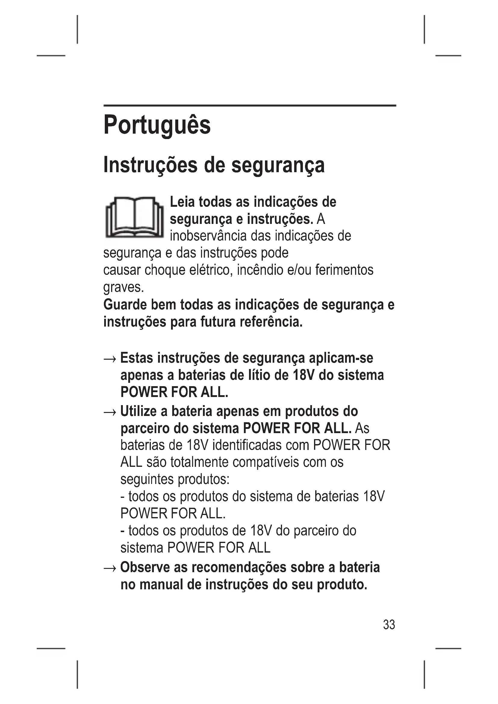 Estas instruções de segurança aplicam-se apenas a baterias de lítio de 18V do sistema POWER FOR ALL.