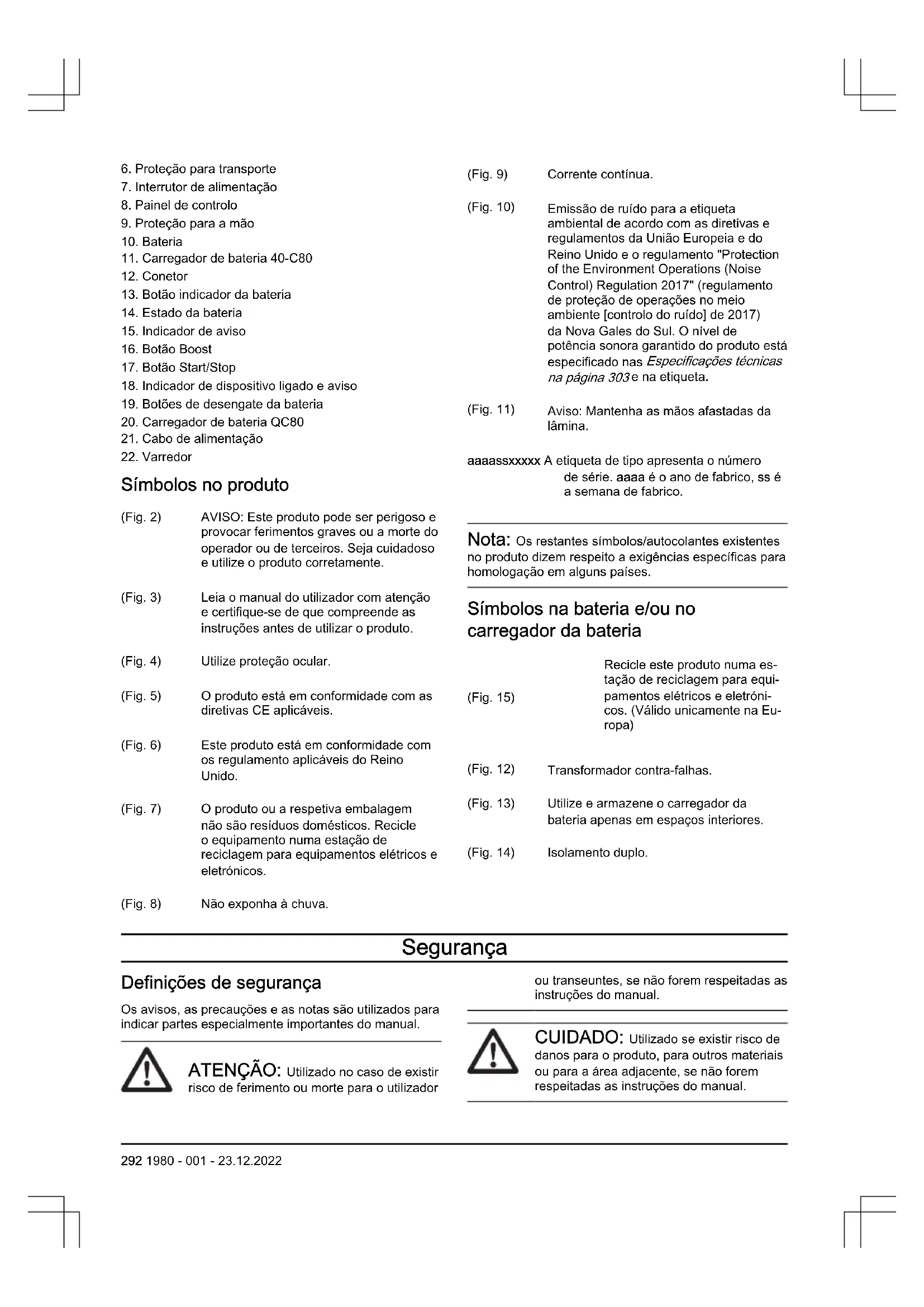 Símbolos no produto (Fig. 2) AVISO: Este produto pode ser perigoso e provocar ferimentos graves ou a morte do operador ou de terceiros. Seja cuidadoso e utilize o produto corretamente. (Fig. 3) Leia o manual do utilizador com atenção e certifique-se de que compreende as instruções antes de utilizar o produto. (Fig. 4) Utilize proteção ocular. (Fig. 5) O produto está em conformidade com as diretivas CE aplicáveis. (Fig. 6) Este produto está em conformidade com os regulamento aplicáveis do Reino Unido. (Fig. 7) O produto ou a respetiva embalagem não são resíduos domésticos. Recicle o equipamento numa estação de reciclagem para equipamentos elétricos e eletrónicos. (Fig. 8) Não exponha à chuva. (Fig. 9) Corrente contínua. (Fig. 10) Emissão de ruído para a etiqueta ambiental de acordo com as diretivas e regulamentos da União Europeia e do Reino Unido e o regulamento "Protection of the Environment Operations (Noise Control) Regulation 2017" (regulamento de proteção de operações no meio ambiente [controlo do ruído] de 2017) da Nova Gales do Sul. O nível de potência sonora garantido do produto está especificado nas Especificações técnicas na página 303 e na etiqueta. (Fig. 11) Aviso: Mantenha as mãos afastadas da lâmina. aaaassxxxxx A etiqueta de tipo apresenta o número de série. aaaa é o ano de fabrico, ss é a semana de fabrico. Nota: Os restantes símbolos/autocolantes existentes no produto dizem respeito a exigências específicas para homologação em alguns países. Símbolos na bateria e/ou no carregador da bateria (Fig. 15) Recicle este produto numa es- tação de reciclagem para equi- pamentos elétricos e eletróni- cos. (Válido unicamente na Eu- ropa) (Fig. 12) Transformador contra-falhas. (Fig. 13) Utilize e armazene o carregador da bateria apenas em espaços interiores. (Fig. 14) Isolamento duplo. Segurança Definições de segurança Os avisos, as precauções e as notas são utilizados para indicar partes especialmente importantes do manual. ATENÇÃO: Utilizado no caso de existir risco de ferimento ou morte para o utilizador ou transeuntes, se não forem respeitadas as instruções do manual. CUIDADO: Utilizado se existir risco de danos para o produto, para outros materiais ou para a área adjacente, se não forem respeitadas as instruções do manual. 292 1980 - 001 - 23.12.2022Nota: Utilizado para disponibilizar informações adicionais necessárias numa determinada situação. Avisos gerais de segurança da ferramenta eléctrica ATENÇÃO: Leia todos os avisos de segurança e todas as instruções. O incumprimento dos avisos e das instruções poderá resultar em choques elétricos, incêndios e/ou ferimentos graves. Nota: Guarde todos os avisos e instruções para referência futura. O termo "ferramenta elétrica" nos avisos refere-se à sua ferramenta elétrica com ligação à corrente (com cabo) ou ferramenta elétrica com bateria (sem cabo). Segurança no local de trabalho