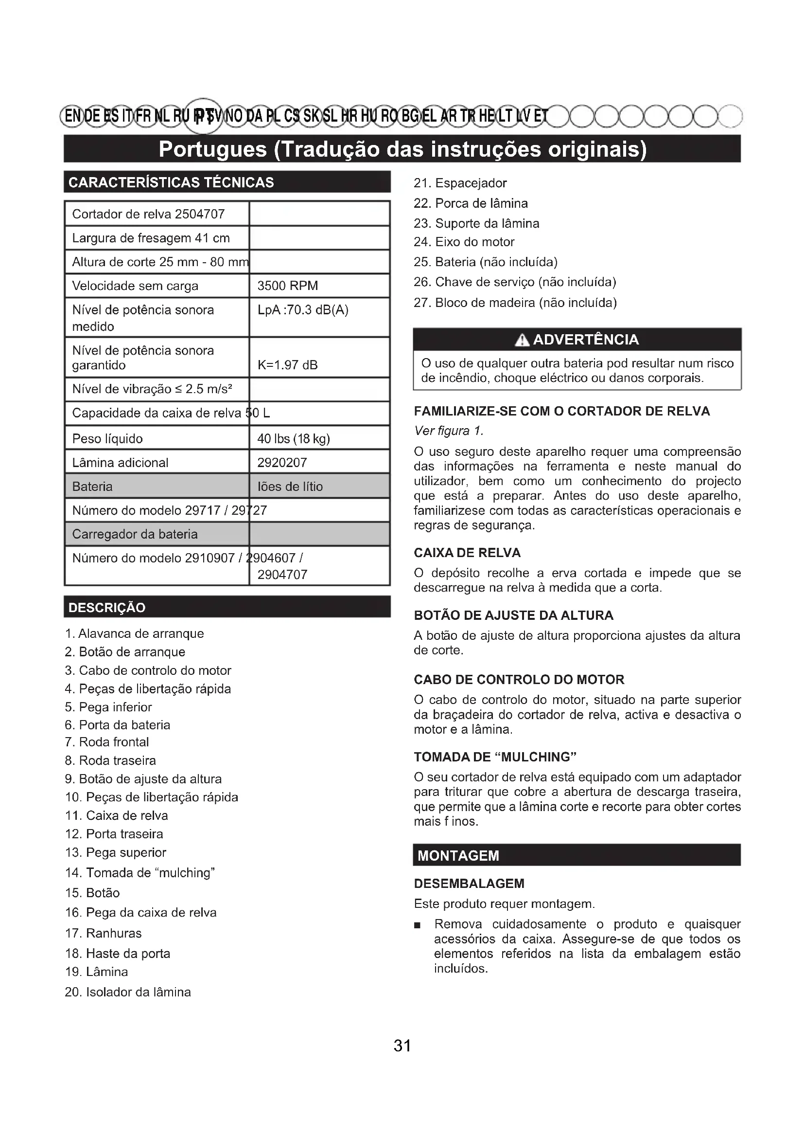Problème Cause possible SolutionLe guidon n'est pas en position.Les boulons du chariot ne sont pasbien en place.Ajustez la hauteur de la poignée et assurez-vous que les boulons du chariot sont bien en place.La tondeuse ne démarre pas.La batterie est faiblement chargée Chargez la batterie.La batterie est soit hors service oun'accepte pas la charge.Changez la batterie.La tonte se fait de façon inégale.La pelouse est dense ou inégale ou la hauteur de coupe n'a pas été réglée de façon correcte.Réglez les roues en position plus haute. Toutes les roues doivent être réglées à la même hauteur de coupe pour que la tonte se fasse de façon uniforme.Le paillage se fait mal.De l'herbe humide coupée s'est agglutinée sous le carter.Attendez que l'herbe ait séché avant de la tondre.La tondeuse est diffi cile à pousser.Herbes hautes, arrière du carter de la tondeuse et lame agglutinés d’herbe, ou hauteur de coupe trop faible.Augmentez la hauteur de coupe.Le ramassage de fait mal.La hauteur de coupe est réglée trop bas. Augmentez la hauteur de coupe.La tondeuse vibre à haut régime.La lame est déséquilibrée, usée de façon excessive ou usée de façon inégale.Remplacez la lame.L'arbre moteur est tordu.Arrêtez le moteur, retirez la clé de sécurité et la batterie, débranchez la source d'alimentation, et vérifi ez les dommages éventuels. Faites effectuer les réparations par un service après-vente agréé avant de vous resservir de la tondeuse.Le moteur s'arrête en cours de tonte.La hauteur de coupe est réglée trop bas. Augmentez la hauteur de coupe.La batterie est déchargée. Chargez la batterie.Si ces solutions ne résolvent pas le problème, contactez votre service après-vente agréé. 30PT EN DE ES IT FR NL RU FI SV NO DA PL CS SK SL HR HU RO BG EL AR TR HE LT LV ET Portugues (Tradução das instruções originais) CARACTERÍSTICAS TÉCNICASCortador de relva 2504707 Largura de fresagem 41 cmAltura de corte 25 mm - 80 mmVelocidade sem carga 3500 RPMNível de potência sonora medidoLpA :70.3 dB(A)Nível de potência sonora garantidoLwA :90.3 dB(A), K=1.97 dBNível de vibração ≤ 2.5 m/s²Capacidade da caixa de relva 50 L Peso líquido 40 lbs (18 kg) Lâmina adicional 2920207Bateria Iões de lítioNúmero do modelo 29717 / 29727 Carregador da bateriaNúmero do modelo 2910907 / 2904607 / 2904707DESCRIÇÃO1. Alavanca de arranque2. Botão de arranque 3. Cabo de controlo do motor4. Peças de libertação rápida5. Pega inferior6. Porta da bateria7. Roda frontal8. Roda traseira9. Botão de ajuste da altura10. Peças de libertação rápida11. Caixa de relva12. Porta traseira13. Pega superior14. Tomada de “mulching”15. Botão16. Pega da caixa de relva17. Ranhuras18. Haste da porta19. Lâmina20. Isolador da lâmina 21. Espacejador22. Porca de lâmina 23. Suporte da lâmina24. Eixo do motor25. Bateria (não incluída)26. Chave de serviço (não incluída)27. Bloco de madeira (não incluída) ADVERTÊNCIA O uso de qualquer outra bateria pod resultar num risco de incêndio, choque eléctrico ou danos corporais.FAMILIARIZE-SE COM O CORTADOR DE RELVAVer gura 1.O uso seguro deste aparelho requer uma compreensão das informações na ferramenta e neste manual do utilizador, bem como um conhecimento do projecto que está a preparar. Antes do uso deste aparelho, familiarizese com todas as características operacionais e regras de segurança.CAIXA DE RELVAO depósito recolhe a erva cortada e impede que se descarregue na relva à medida que a corta.BOTÃO DE AJUSTE DA ALTURA A bot de ajuste de altura proporciona ajustes da altura de corte.CABO DE CONTROLO DO MOTORO cabo de controlo do motor, situado na parte superior da braçadeira do cortador de relva, activa e desactiva o motor e a lâmina.TOMADA DE “MULCHING”O seu cortador de relva está equipado com um adaptador para triturar que cobre a abertura de descarga traseira, que permite que a lâmina corte e recorte para obter cortes mais f inos.MONTAGEMDESEMBALAGEMEste produto requer montagem. ■ Remova cuidadosamente o produto e quaisquer acessórios da caixa. Assegure-se de que todos os elementos referidos na lista da embalagem estão incluídos. 31PT EN DE ES IT FR NL RU FI SV NO DA PL CS SK SL HR HU RO BG EL AR TR HE LT LV ET Portugues (Tradução das instruções originais) ADVERTÊNCIA Não use este produto caso alguma das peças na Lista da embalagem já se encontre montada no seu produto ao desembalar. As peças nesta lista não são montadas no produto pelo fabricante e requerem a instalação por parte do cliente. O uso de um aparelho que tenha sido montado de forma inadequada poderá causar lesões pessoais graves. ■ Inspeccione o produto cuidadosamente para se certificar que não houve quebra ou danos durante o transporte. ■ Não deite fora o material da embalagem até ter inspeccionado cuidadosamente o produto e o ter posto a trabalhar. ■ Caso falte alguma peça ou alguma peça esteja danificada, por favor contacte o seu centro de serviço Greenworks tools para ter assistência.LISTA DE EMBALAGEM ■ Cortador de relva ■ Chave da bateria ■ Caixa de relva ■ Tomada de “mulching” ■ Manual do operador ADVERTÊNCIA Se qualquer peça estiver danif icada ou em falta, não utilize este produto até as peças serem repostas. O uso de um produto com peças em falta ou cujas peças estejam danif icadas, pode produzir lesões pessoais graves. ADVERTÊNCIA Não tente modif icar este produto ou criar acessórios não recomendados para o uso com este produto. Quaisquer destas alterações ou modif icações representam um uso indevido e pode resultar em condições perigosas ocasionando eventuais ferimentos graves pessoais. ADVERTÊNCIA Nunca utilize a máquina de cortar relva sem os adequados dispositivos de segurança colocados e em perfeitas condições. Nunca opere o corta relva com dispositivos de segurança danif icados. A operação deste aparelho com peças danif icadas ou em falta poderia con