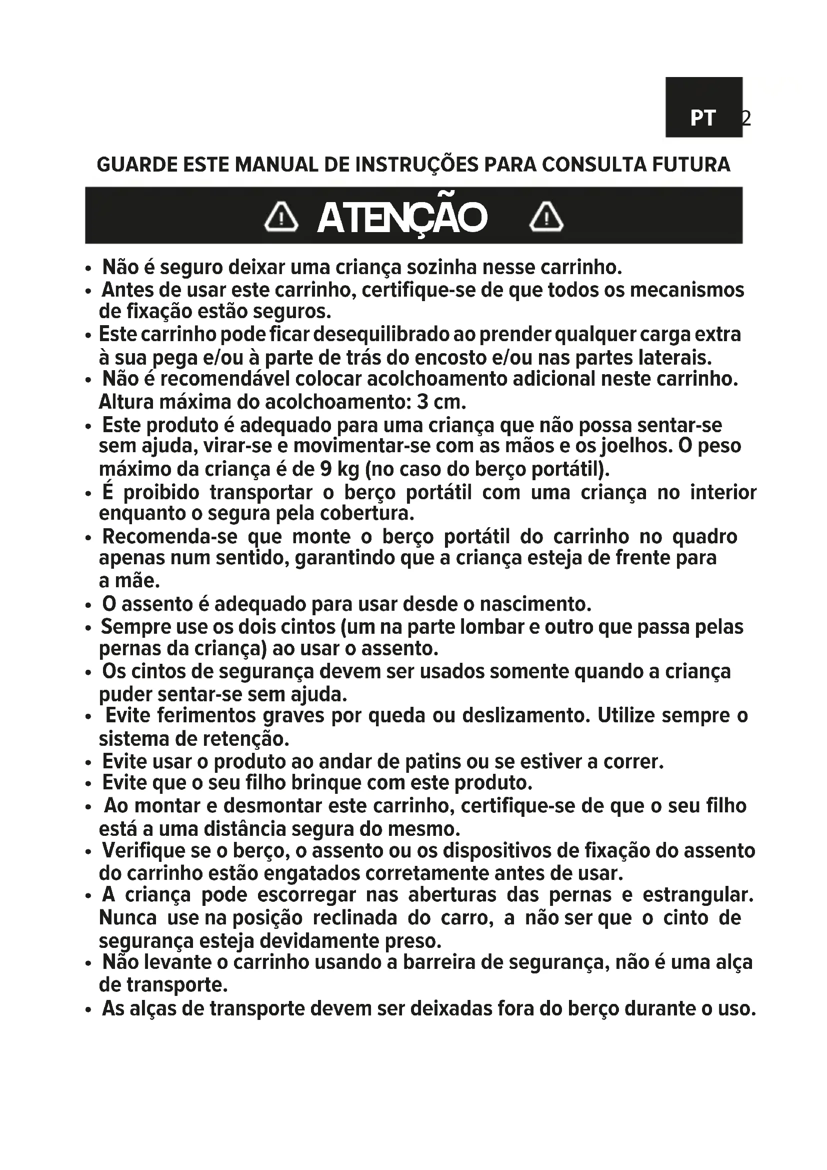 - As alças de transporte devem ser deixadas fora do berço durante o uso.PT123 PRECAUÇÕES ANTES DE USAR O NOSSO CARRINHO, LEIA ATENTAMENTE ESTE MANUAL DE MANUTENÇÃO.