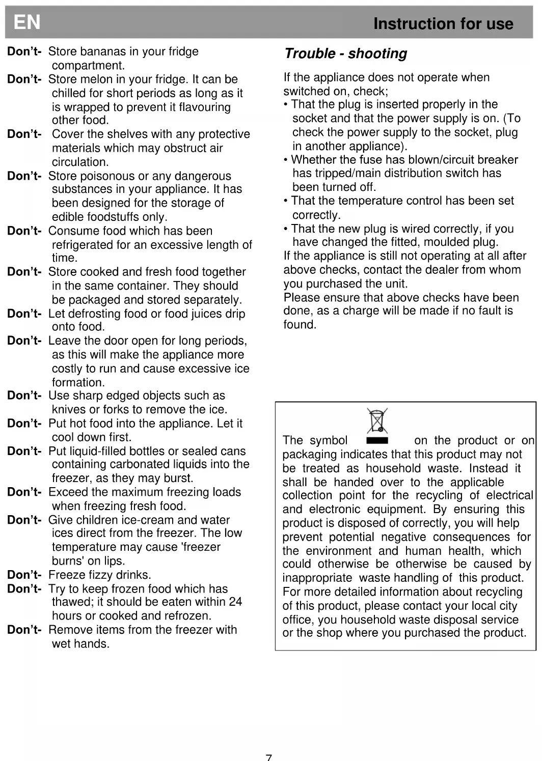 prejudicará o desempenho do equipamento. Recolocação da porta Siga as instruções por ordem numérica (Item 7). 13PT Instruções de utilização Procedimentos correctos e incorrectos Correcto- Limpar e descongelar periodicamente o frigorífico (Consulte a secção "Descongelação") Correcto- Guardar a carne crua e de aves sob os alimentos cozinhados e os produtos lácteos. Correcto- Retirar dos vegetais as folhas não utilizáveis e limpar toda a sujidade. Correcto- Deixar as alfaces, couves, salsa e couve-flor com o talo. Correcto- Envolver primeiro o queijo em papel vegetal e, em seguida, colocá-lo num saco de polietileno, retirando a maior quantidade de ar possível. Para obter os melhores resultados, retirar os alimentos do compartimento do frigorífico uma hora antes de consumi-los. Correcto- Envolver a carne crua e de aves em polietileno ou papel de alumínio. Este procedimento evita que os alimentos sequem. Correcto- Colocar o peixe e os restos em sacos de polietileno. Correcto- Colocar os alimentos com cheiro intenso ou que possam secar em sacos de polietileno, envolvê-los em papel de alumínio ou colocá-los em recipientes herméticos. Correcto- Envolver bem o pão para mantê-lo fresco. Correcto- Esfriar os vinhos brancos, cervejas, e águas minerais antes de os servir. Correcto- Verificar periodicamente o conteúdo do congelador. Correcto- Manter os alimentos no frigorífico o menor tempo possível e respeitar as datas de validade. Correcto- Armazenar os alimentos pré- congelados de acordo com as instruções fornecidas nas embalagens. Correcto- Escolher sempre alimentos frescos de alta qualidade e certificar-se de que estão totalmente limpos antes de os congelar. Correcto- Preparar os alimentos frescos para congelação em pequenas quantidades, para garantir uma congelação rápida. Correcto- Envolver todos os alimentos em papel de alumínio ou colocá-los em sacos de polietileno para congelação, retirando todo o ar. Correcto- Envolver os alimentos congelados imediatamente após a aquisição e colocá-los no congelador o mais rápido possível. Correcto- Descongelar os alimentos no compartimento do frigorífico. Incorrecto- Armazenar bananas no compartimento do frigorífico. Incorrecto- Armazenar melões no frigorífico. Estes podem ser esfriados durante curtos períodos de tempo, desde que sejam envolvidos para evitar que fiquem com sabor de outros alimentos. Incorrecto- Cobrir as prateleiras com materiais de protecção que possam obstruir a circulação de ar. Incorrecto- Guardar substâncias venenosas ou perigosas no frigorífico. Ele foi concebido para armazenar apenas alimentos comestíveis. Incorrecto- Consumir alimentos que estiveram no frigorífico durante períodos excessivos de tempo. Incorrecto- Armazenar, no mesmo recipiente, alimentos cozinhados e frescos. Eles deverão ser embalados e guardados separadamente. Incorrecto- Deixar que os alimentos descongelados ou sumos pinguem para os alimentos. Incorrecto- Deixar a porta aberta durante grandes períodos de tempo, o que encarece o custo de funcionamento e causa a formação excessiva de gelo. Incorrecto- Utilizar objectos pontiagudos, como facas ou garfos, para remover o gelo. Incorrecto- Colocar alimentos quentes no frigorífico. Primeiro, deixe arrefecer os alimentos. Incorrecto- Colocar garrafas ou latas herméticas completamente cheias com líquidos gaseificados, já que podem rebentar. Incorrecto- Ultrapassar a carga máxima quando congelar alimentos frescos. Incorrecto- Dar às crianças gelados e cubos de gelo directamente do congelador. A temperatura baixa pode provocar queimaduras nos lábios. Incorrecto- Congelar bebidas gaseificadas. Incorrecto- Tentar recongelar alimentos que tenham sido descongelados; Estes alimentos devem ser consumidos no prazo de 24 horas ou cozinhados e recongelados. Incorrecto- Retirar alimentos do congelador com as mãos molhadas. 14PT Instruções de utilização Resolução de problemas Se o congelador não funcionar depois de ter sido ligado, verifique se:
