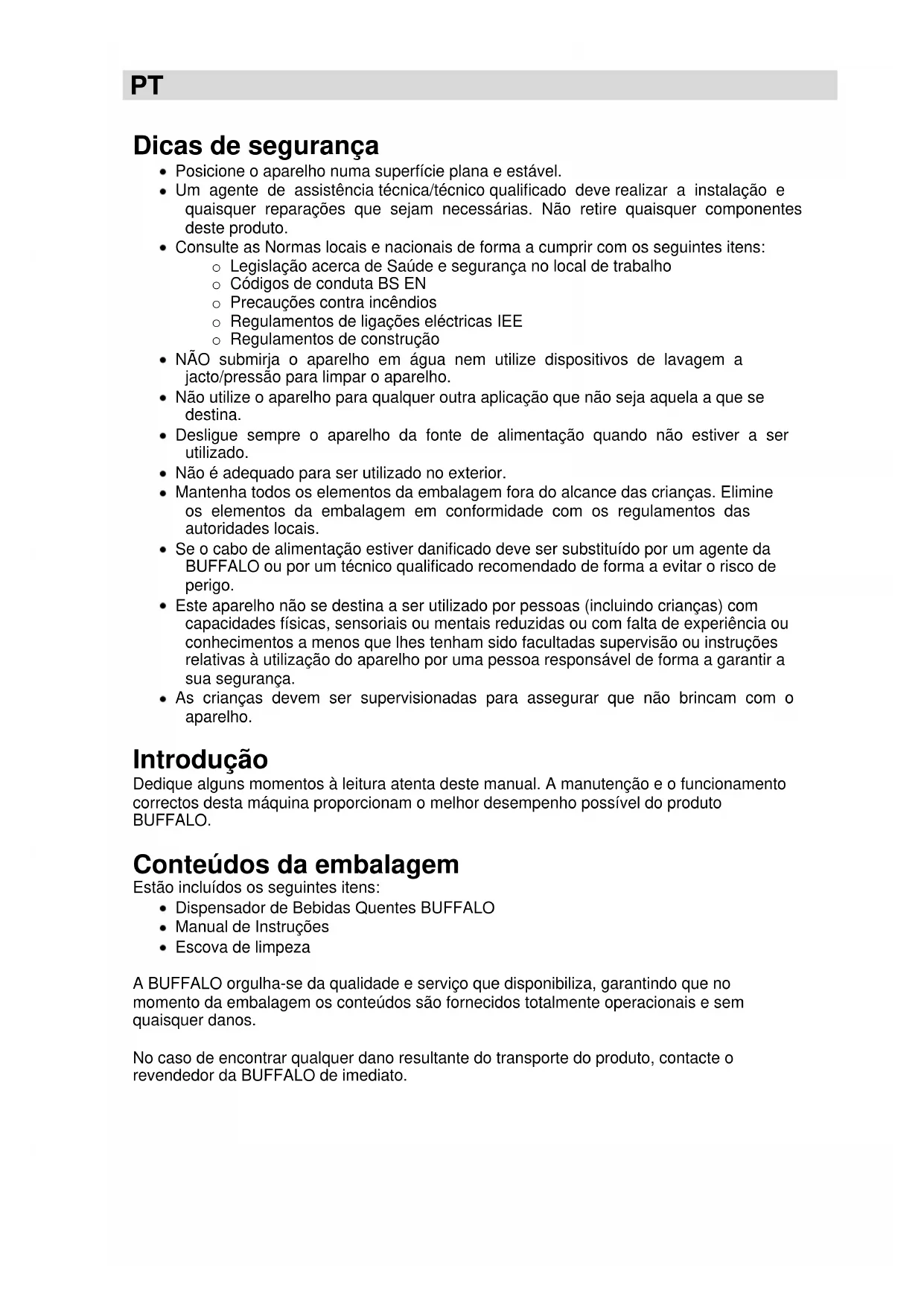 Dicas de segurança Posicione o aparelho numa superfície plana e estável. Um agente de assistência técnica/técnico qualificado deve realizar a instalação e quaisquer reparações que sejam necessárias. Não retire quaisquer componentes deste produto. Consulte as Normas locais e nacionais de forma a cumprir com os seguintes itens: o Legislação acerca de Saúde e segurança no local de trabalho o Códigos de conduta BS EN o Precauções contra incêndios o Regulamentos de ligações eléctricas IEE o Regulamentos de construção NÃO submirja o aparelho em água nem utilize dispositivos de lavagem a jacto/pressão para limpar o aparelho. Não utilize o aparelho para qualquer outra aplicação que não seja aquela a que se destina. Desligue sempre o aparelho da fonte de alimentação quando não estiver a ser utilizado. Não é adequado para ser utilizado no exterior. Mantenha todos os elementos da embalagem fora do alcance das crianças. Elimine os elementos da embalagem em conformidade com os regulamentos das autoridades locais. Se o cabo de alimentação estiver danificado deve ser substituído por um agente da BUFFALO ou por um técnico qualificado recomendado de forma a evitar o risco de perigo. Este aparelho não se destina a ser utilizado por pessoas (incluindo crianças) com capacidades físicas, sensoriais ou mentais reduzidas ou com falta de experiência ou conhecimentos a menos que lhes tenham sido facultadas supervisão ou instruções relativas à utilização do aparelho por uma pessoa responsável de forma a garantir a sua segurança. As crianças devem ser supervisionadas para assegurar que não brincam com o aparelho. Introdução Dedique alguns momentos à leitura atenta deste manual. A manutenção e o funcionamento correctos desta máquina proporcionam o melhor desempenho possível do produto BUFFALO. Conteúdos da embalagem Estão incluídos os seguintes itens: Dispensador de Bebidas Quentes BUFFALO Manual de Instruções Escova de limpeza A BUFFALO orgulha-se da qualidade e serviço que disponibiliza, garantindo que no momento da embalagem os conteúdos são fornecidos totalmente operacionais e sem quaisquer danos. No caso de encontrar qualquer dano resultante do transporte do produto, contacte o revendedor da BUFFALO de imediato.PT