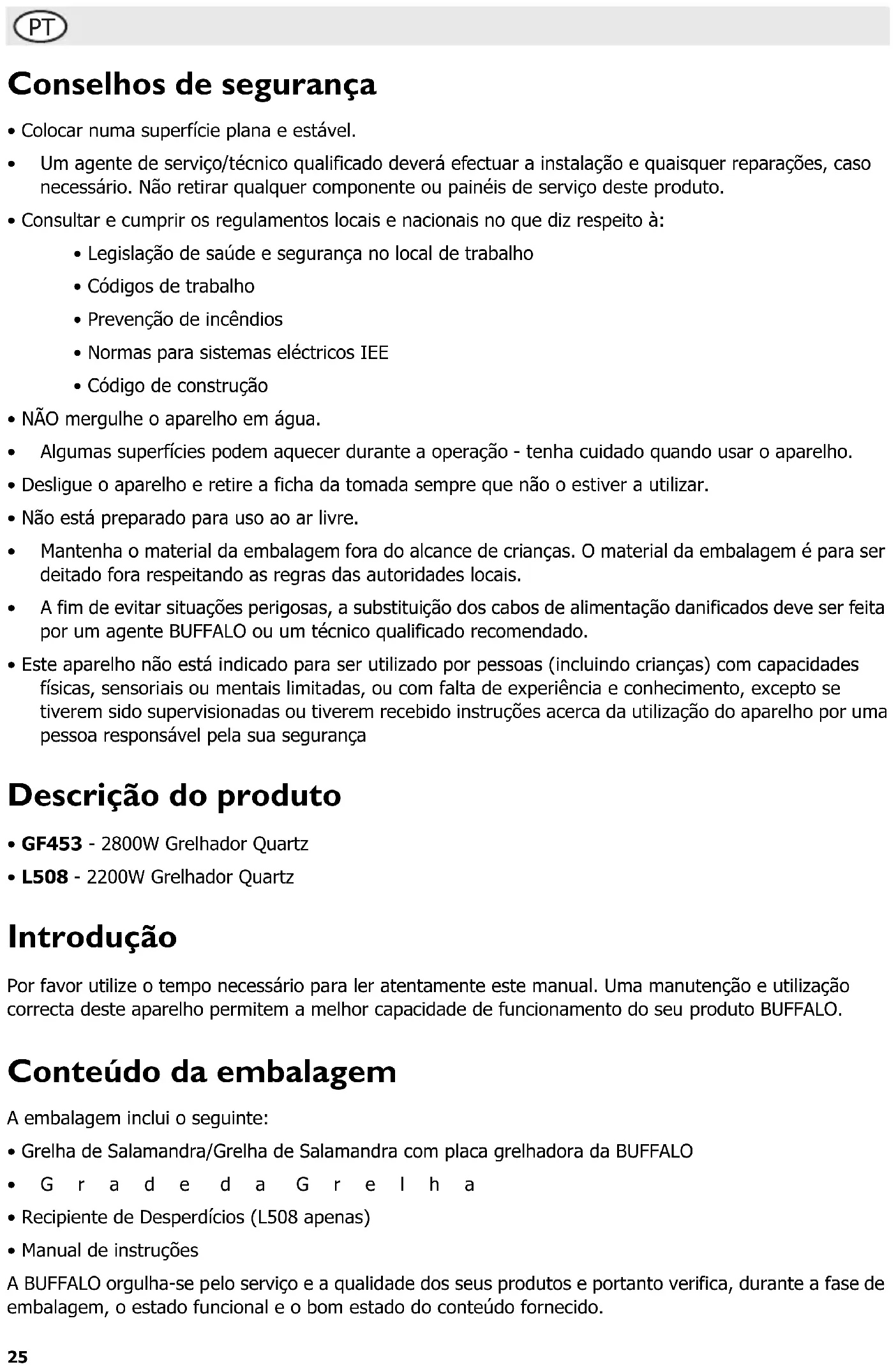 - L508 - 2200W Grelhador Quartz Introdução Por favor utilize o tempo necessário para ler atentamente este manual. Uma manutenção e utilização correcta deste aparelho permitem a melhor capacidade de funcionamento do seu produto BUFFALO. Conteúdo da embalagem A embalagem inclui o seguinte: