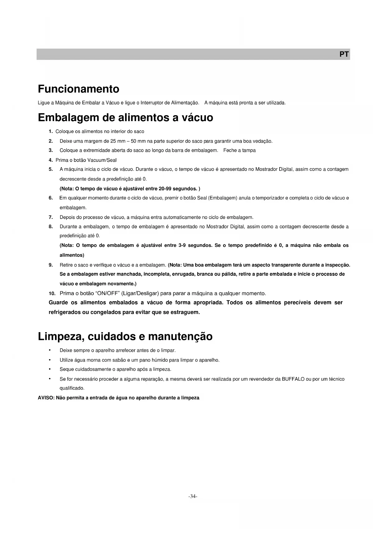 Dicas de segurança Posicione o aparelho numa superfície plana e estável. Um agente de assistência técnica/técnico qualificado deve realizar a instalação e quaisquer reparações que sejam necessárias. Não retire quaisquer componentes deste produto. Consulte as Normas locais e nacionais de forma a cumprir com os seguintes itens: o Legislação acerca de Saúde e segurança no local de trabalho o Códigos de conduta BS EN o Precauções contra incêndios o Regulamentos de ligações eléctricas IEE o Regulamentos de construção NÃO submirja o aparelho em água. A barra de embalar aquece durante a utilização. NÃO toque na barra de embalar durante ou imediatamente após o funcionamento. Não desligue o aparelho na tomada para interromper o funcionamento, utilize sempre o botão Cancel (Cancelar). Não utilize o aparelho para qualquer outra aplicação que não seja aquela a que se destina. Utilize sempre os sacos recomendados pelo fornecedor/fabricante com o aparelho. Desligue sempre o aparelho da fonte de alimentação quando não estiver a ser utilizado. Não é adequado para ser utilizado no exterior. Mantenha todos os elementos da embalagem fora do alcance das crianças. Elimine os elementos da embalagem em conformidade com os regulamentos das autoridades locais. Se o cabo de alimentação estiver danificado deve ser substituído por um agente da BUFFALO ou por um técnico qualificado recomendado de forma a evitar o risco de perigo. Este aparelho não se destina a ser utilizado por pessoas (incluindo crianças) com capacidades físicas, sensoriais ou mentais reduzidas ou com falta de experiência ou conhecimentos a menos que lhes tenham sido facultadas supervisão ou instruções relativas à utilização do aparelho por uma pessoa responsável de forma a garantir a sua segurança. As crianças devem ser supervisionadas para assegurar que não brincam com o aparelho. Introdução Dedique alguns momentos à leitura atenta deste manual. A manutenção e o funcionamento correctos desta máquina proporcionam o melhor desempenho possível do produto BUFFALO. Conteúdos da embalagem Estão incluídos os seguintes itens: Máquina de embalar a vácuo BUFFALO Manual de Instruções A BUFFALO orgulha-se da qualidade e serviço que disponibiliza, garantindo que no momento da embalagem os conteúdos são fornecidos totalmente operacionais e sem quaisquer danos. No caso de encontrar qualquer dano resultante do transporte do produto, contacte o revendedor da BUFFALO de imediato.-34-