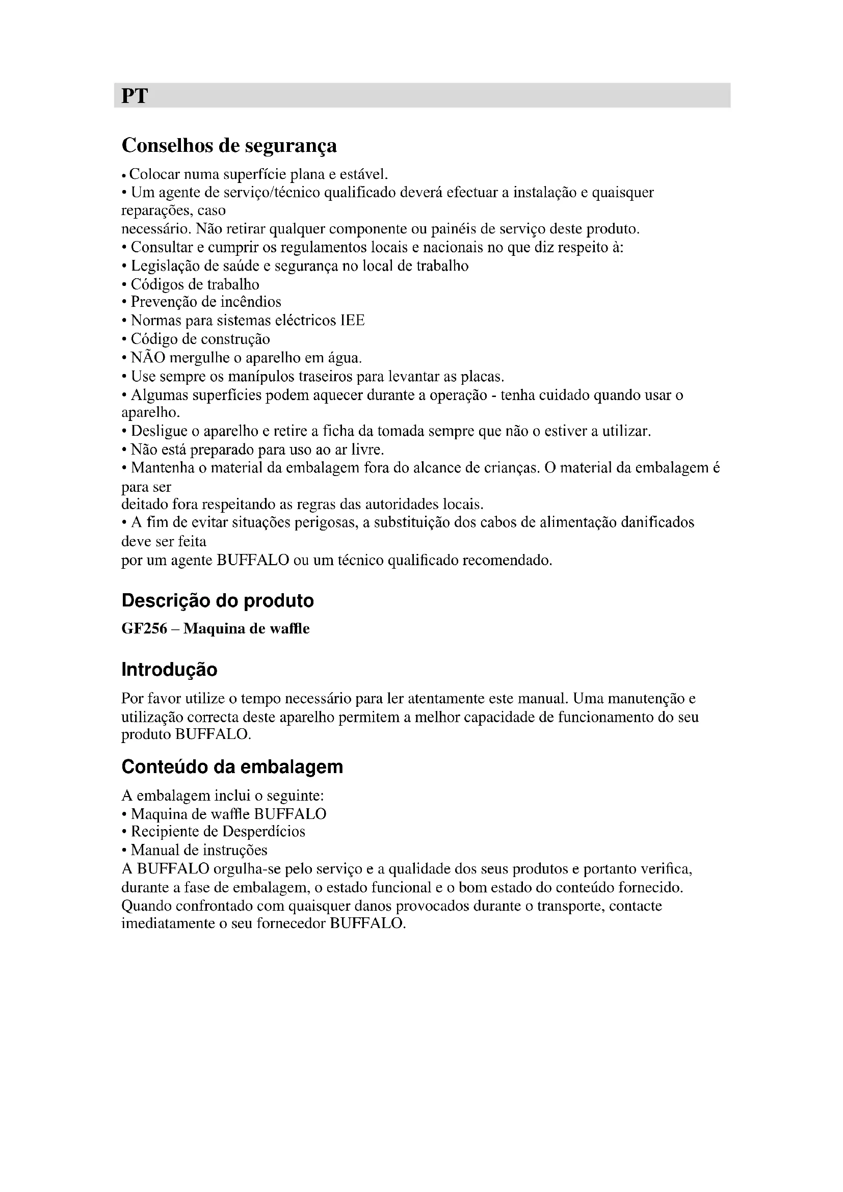 - A fim de evitar situações perigosas, a substituição dos cabos de alimentação danificados deve ser feita por um agente BUFFALO ou um técnico qualificado recomendado. Descrição do produto GF256 – Maquina de waffle Introdução Por favor utilize o tempo necessário para ler atentamente este manual. Uma manutenção e utilização correcta deste aparelho permitem a melhor capacidade de funcionamento do seu produto BUFFALO. Conteúdo da embalagem A embalagem inclui o seguinte: