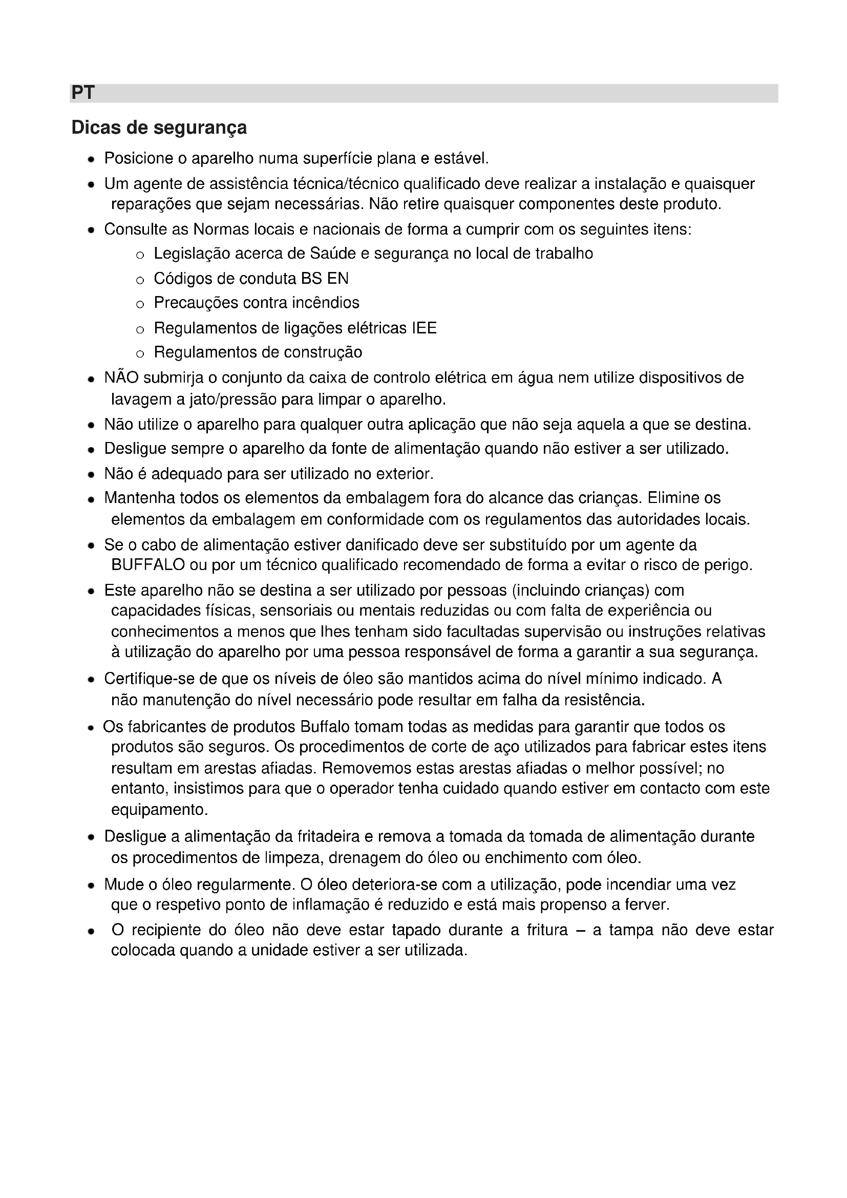 Reservados todos los derechos. Prohibida la reproducción o transmisión en cualquier forma o por cualquier medio, tanto electrónico como mecánico, de fotocopia, grabación o de otro tipo, de ninguna parte de estas instrucciones sin la autorización previa y por escrito de BUFFALO. Se han realizado los máximos esfuerzos para garantizar que todos los datos son correctos en el momento de su impresión; sin embargo, BUFFALO se reserva el derecho a modificar las especificaciones sin previo aviso.PT Dicas de segurança Posicione o aparelho numa superfície plana e estável. Um agente de assistência técnica/técnico qualificado deve realizar a instalação e quaisquer reparações que sejam necessárias. Não retire quaisquer componentes deste produto. Consulte as Normas locais e nacionais de forma a cumprir com os seguintes itens: o Legislação acerca de Saúde e segurança no local de trabalho o Códigos de conduta BS EN o Precauções contra incêndios o Regulamentos de ligações elétricas IEE o Regulamentos de construção NÃO submirja o conjunto da caixa de controlo elétrica em água nem utilize dispositivos de lavagem a jato/pressão para limpar o aparelho. Não utilize o aparelho para qualquer outra aplicação que não seja aquela a que se destina. Desligue sempre o aparelho da fonte de alimentação quando não estiver a ser utilizado. Não é adequado para ser utilizado no exterior. Mantenha todos os elementos da embalagem fora do alcance das crianças. Elimine os elementos da embalagem em conformidade com os regulamentos das autoridades locais. Se o cabo de alimentação estiver danificado deve ser substituído por um agente da BUFFALO ou por um técnico qualificado recomendado de forma a evitar o risco de perigo. Este aparelho não se destina a ser utilizado por pessoas (incluindo crianças) com capacidades físicas, sensoriais ou mentais reduzidas ou com falta de experiência ou conhecimentos a menos que lhes tenham sido facultadas supervisão ou instruções relativas à utilização do aparelho por uma pessoa responsável de forma a garantir a sua segurança. Certifique-se de que os níveis de óleo são mantidos acima do nível mínimo indicado. A não manutenção do nível necessário pode resultar em falha da resistência. Os fabricantes de produtos Buffalo tomam todas as medidas para garantir que todos os produtos são seguros. Os procedimentos de corte de aço utilizados para fabricar estes itens resultam em arestas afiadas. Removemos estas arestas afiadas o melhor possível; no entanto, insistimos para que o operador tenha cuidado quando estiver em contacto com este equipamento. Desligue a alimentação da fritadeira e remova a tomada da tomada de alimentação durante os procedimentos de limpeza, drenagem do óleo ou enchimento com óleo. Mude o óleo regularmente. O óleo deteriora-se com a utilização, pode incendiar uma vez que o respetivo ponto de inflamação é reduzido e está mais propenso a ferver. O recipiente do óleo não deve estar tapado durante a fritura – a tampa não deve estar colocada quando a unidade estiver a ser utilizada.PT Introdução Obrigado por comprar a fritadeira elétrica Buffalo. Antes de operar este produto, deve ler cuidadosamente as instruções e sugestões deste manual, que o ajudarão a obter resultados eficientes e sem problemas com a utilização do produto. Guarde as instruções num local seguro para futura referência. Estes aparelhos destinam-se a ser utilizados em aplicações comerciais, por exemplo, em cozinhas de restaurantes, cantinas, hospitais e em instalações comerciais como padarias, talhos, etc., mas não na produção contínua de alimentos. A Buffalo não aceitará quaisquer responsabilidade por avarias no produto em caso de: As instruções do manual não terem sido seguidas corretamente. Pessoal não qualificado ou não autorizado tiver ajustado a fritadeira. Serem utilizadas peças não originais. A fritadeira não ter sido manuseada e limpa corretamente. A fritadeira ter sido utilizada para outra finalidade diferente daquela a que se destina.
