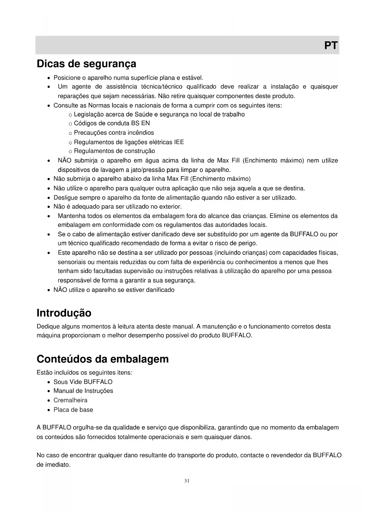 Dicas de segurança Posicione o aparelho numa superfície plana e estável. Um agente de assistência técnica/técnico qualificado deve realizar a instalação e quaisquer reparações que sejam necessárias. Não retire quaisquer componentes deste produto. Consulte as Normas locais e nacionais de forma a cumprir com os seguintes itens: o Legislação acerca de Saúde e segurança no local de trabalho o Códigos de conduta BS EN o Precauções contra incêndios o Regulamentos de ligações elétricas IEE o Regulamentos de construção NÃO submirja o aparelho em água acima da linha de Max Fill (Enchimento máximo) nem utilize dispositivos de lavagem a jato/pressão para limpar o aparelho. Não submirja o aparelho abaixo da linha Max Fill (Enchimento máximo) Não utilize o aparelho para qualquer outra aplicação que não seja aquela a que se destina. Desligue sempre o aparelho da fonte de alimentação quando não estiver a ser utilizado. Não é adequado para ser utilizado no exterior. Mantenha todos os elementos da embalagem fora do alcance das crianças. Elimine os elementos da embalagem em conformidade com os regulamentos das autoridades locais. Se o cabo de alimentação estiver danificado deve ser substituído por um agente da BUFFALO ou por um técnico qualificado recomendado de forma a evitar o risco de perigo. Este aparelho não se destina a ser utilizado por pessoas (incluindo crianças) com capacidades físicas, sensoriais ou mentais reduzidas ou com falta de experiência ou conhecimentos a menos que lhes tenham sido facultadas supervisão ou instruções relativas à utilização do aparelho por uma pessoa responsável de forma a garantir a sua segurança. NÃO utilize o aparelho se estiver danificado Introdução Dedique alguns momentos à leitura atenta deste manual. A manutenção e o funcionamento corretos desta máquina proporcionam o melhor desempenho possível do produto BUFFALO. Conteúdos da embalagem Estão incluídos os seguintes itens: Sous Vide BUFFALO Manual de Instruções Cremalheira Placa de base A BUFFALO orgulha-se da qualidade e serviço que disponibiliza, garantindo que no momento da embalagem os conteúdos são fornecidos totalmente operacionais e sem quaisquer danos. No caso de encontrar qualquer dano resultante do transporte do produto, contacte o revendedor da BUFFALO de imediato.32