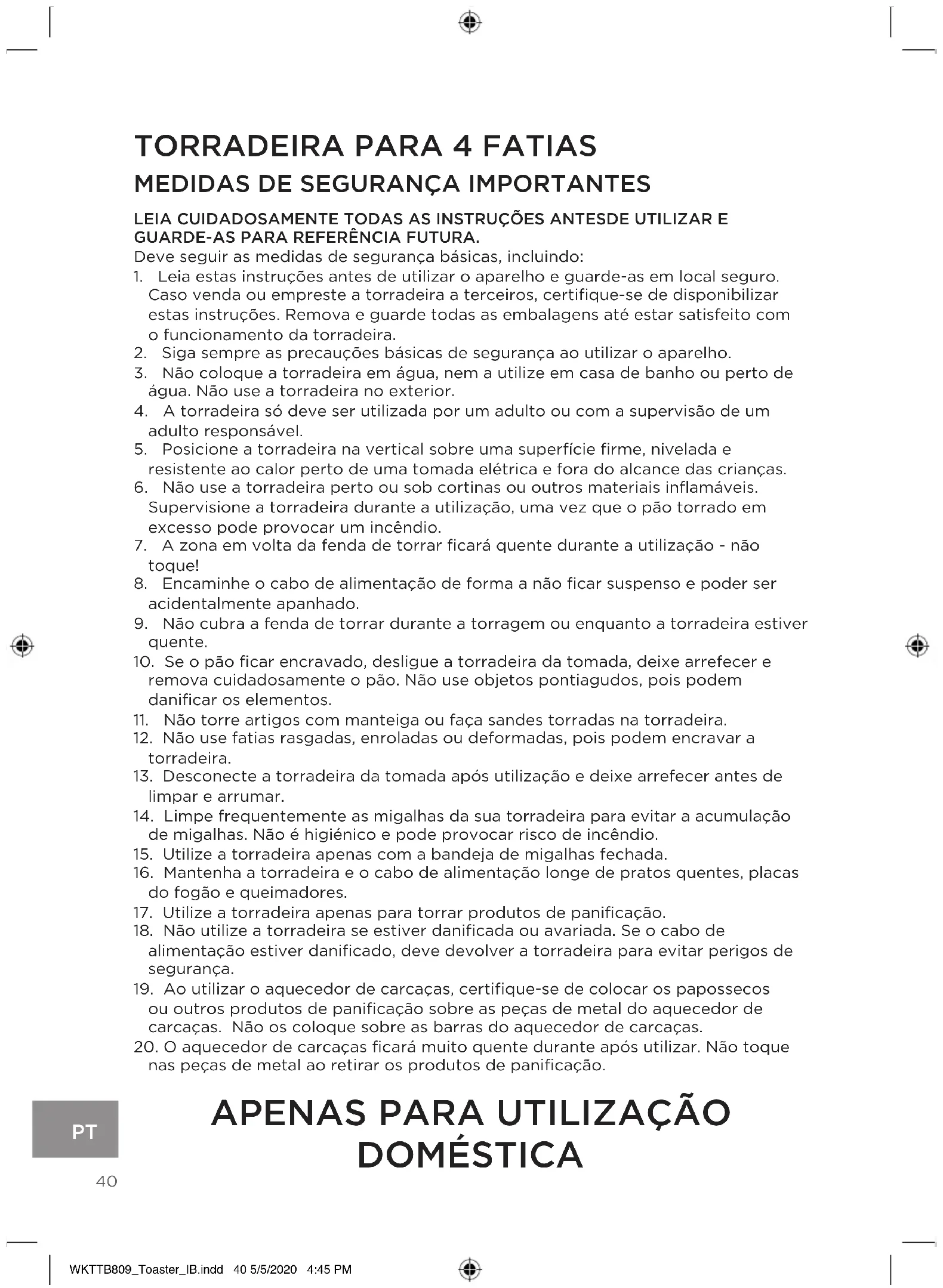 - Nunca utilize solventes, produtos químicos ou agentes de limpeza abrasivos, escovas metálicas, objetos pontiagudos ou esfregões abrasivos para limpar o produto. WKTTB809_Toaster_IB.indd 43 5/5/2020 4:45 PM44