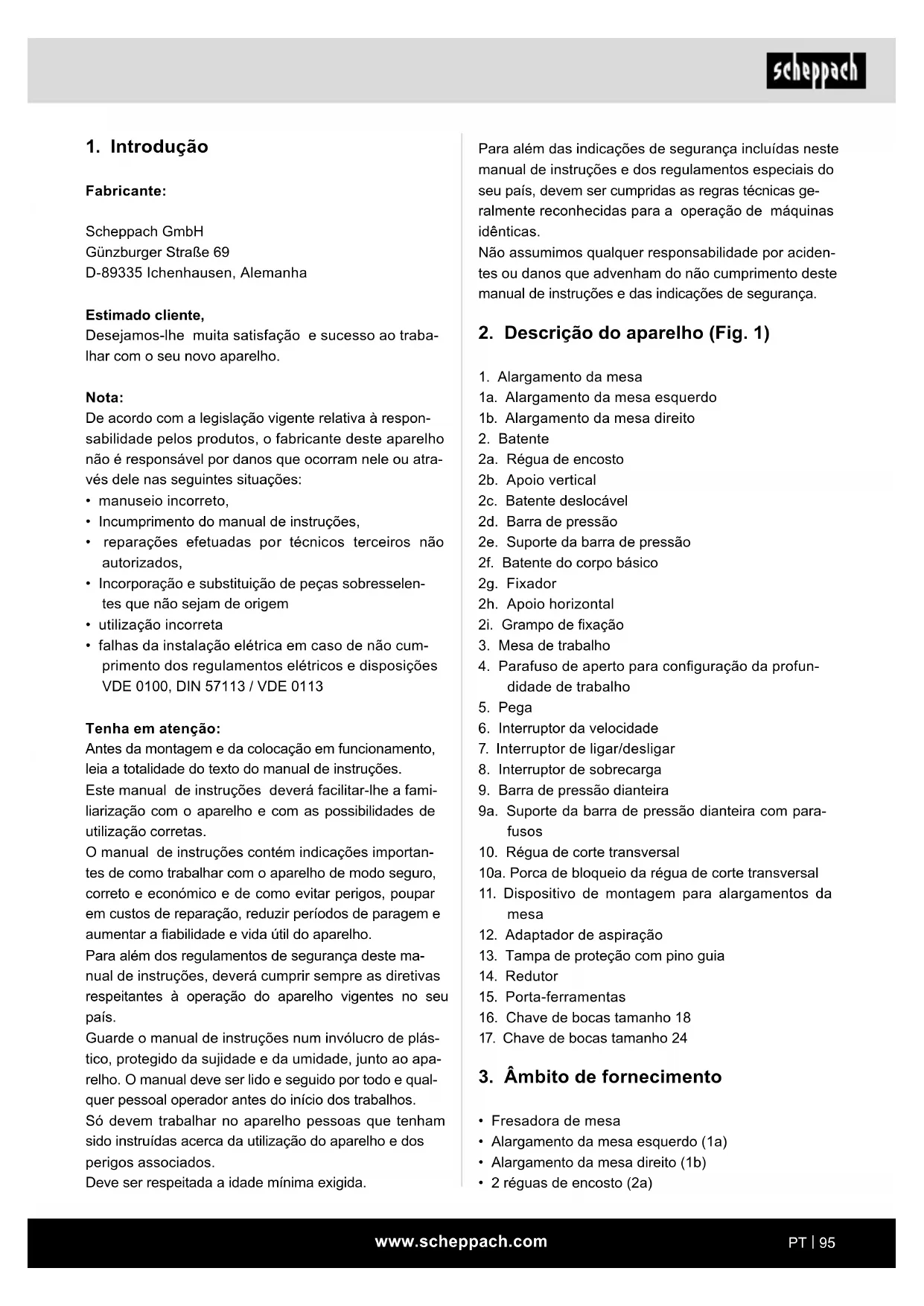 Tenha em atenção: Antes da montagem e da colocação em funcionamento, leia a totalidade do texto do manual de instruções. Este manual de instruções deverá facilitar-lhe a fami- liarização com o aparelho e com as possibilidades de utilização corretas. O manual de instruções contém indicações importan- tes de como trabalhar com o aparelho de modo seguro, correto e económico e de como evitar perigos, poupar em custos de reparação, reduzir períodos de paragem e aumentar a abilidade e vida útil do aparelho. Para além dos regulamentos de segurança deste ma- nual de instruções, deverá cumprir sempre as diretivas respeitantes à operação do aparelho vigentes no seu país. Guarde o manual de instruções num invólucro de plás- tico, protegido da sujidade e da umidade, junto ao apa- relho. O manual deve ser lido e seguido por todo e qual- quer pessoal operador antes do início dos trabalhos. Só devem trabalhar no aparelho pessoas que tenham sido instruídas acerca da utilização do aparelho e dos perigos associados. Deve ser respeitada a idade mínima exigida.www.scheppach.com