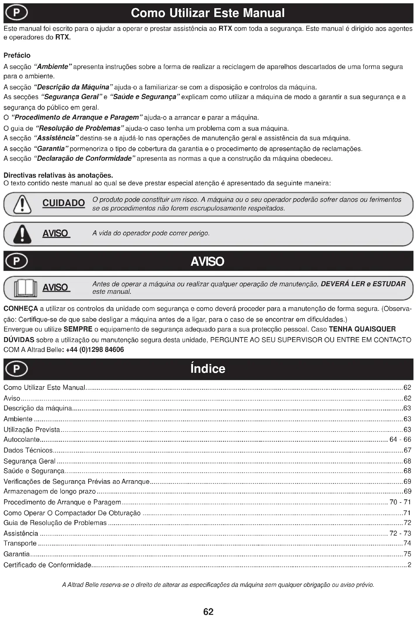 - USE SILICONA E62 Como Utilizar Este Manual Este manual foi escrito para o ajudar a operar e prestar assistência ao RTX com toda a segurança. Este manual é dirigido aos agentes e operadores do RTX. Prefácio A secção “Ambiente” apresenta instruções sobre a forma de realizar a reciclagem de aparelhos descartados de uma forma segura para o ambiente. A secção “Descrição da Máquina” ajuda-o a familiarizar-se com a disposição e controlos da máquina. As secções “Segurança Geral” e “Saúde e Segurança” explicam como utilizar a máquina de modo a garantir a sua segurança e a segurança do público em geral. O “Procedimento de Arranque e Paragem” ajuda-o a arrancar e parar a máquina. O guia de “Resolução de Problemas” ajuda-o caso tenha um problema com a sua máquina. A secção “Assistência” destina-se a ajudá-lo nas operações de manutenção geral e assistência da sua máquina. A secção “Garantia” pormenoriza o tipo de cobertura da garantia e o procedimento de apresentação de reclamações. A secção “Declaração de Conformidade” apresenta as normas a que a construção da máquina obedeceu. Directivas relativas às anotações. O texto contido neste manual ao qual se deve prestar especial atenção é apresentado da seguinte maneira: Índice Como Utilizar Este Manual p. 62