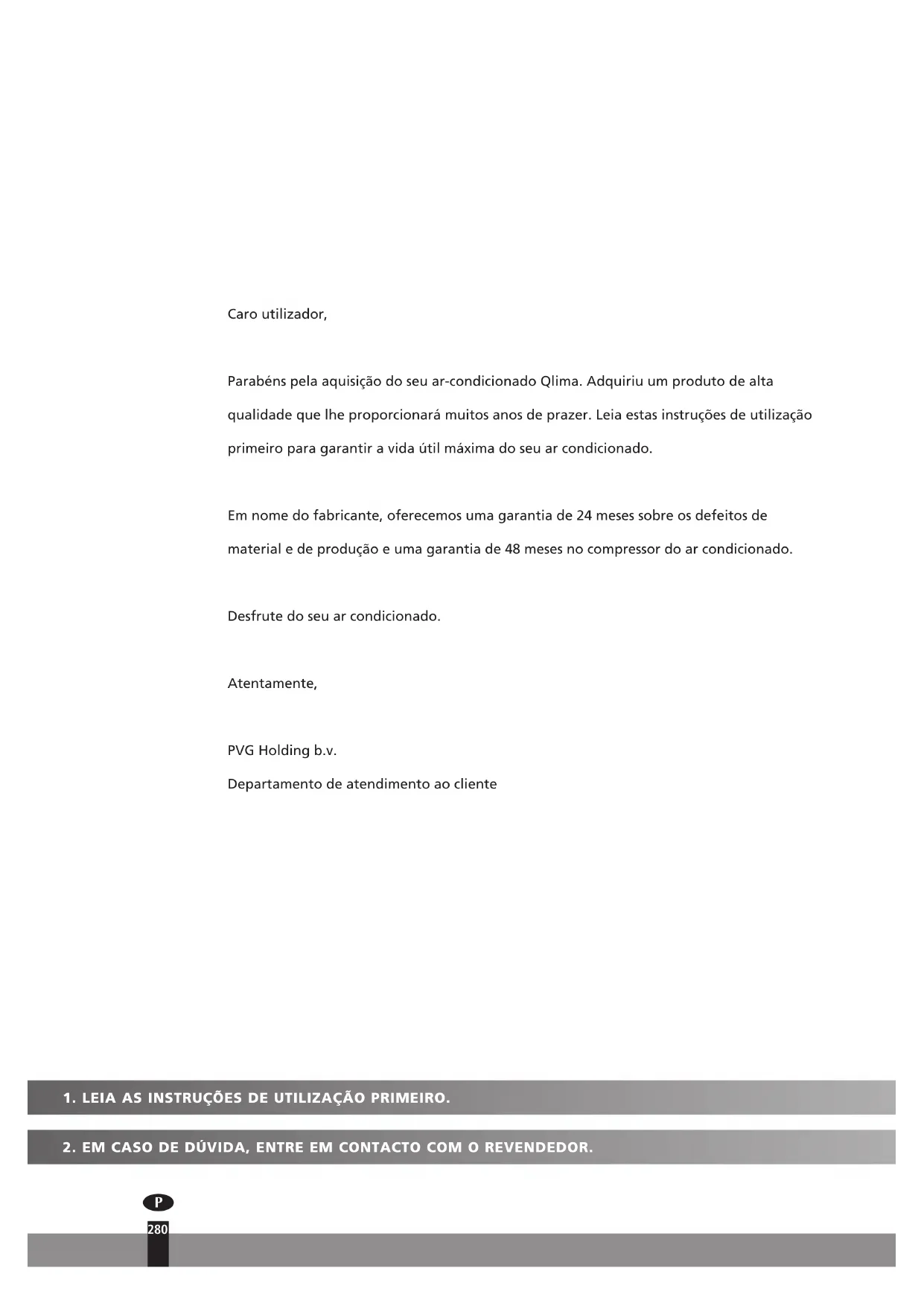 Caro utilizador, Parabéns pela aquisição do seu ar-condicionado Qlima. Adquiriu um produto de alta qualidade que lhe proporcionará muitos anos de prazer. Leia estas instruções de utilização primeiro para garantir a vida útil máxima do seu ar condicionado. Em nome do fabricante, oferecemos uma garantia de 24 meses sobre os defeitos de material e de produção e uma garantia de 48 meses no compressor do ar condicionado. Desfrute do seu ar condicionado. Atentamente, PVG Holding b.v. Departamento de atendimento ao cliente