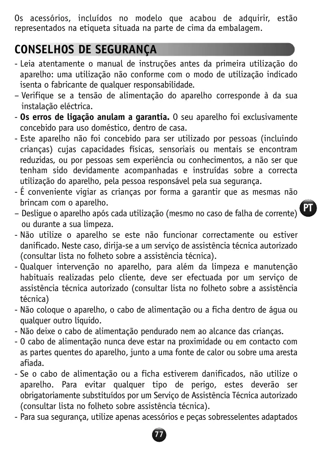 - Lisez attentivement le mode d’emploi avant la première utilisation de votre appareil : une utilisation non conforme au mode d’emploi dégagerait le fabricant de toute responsabilité. - Vérifiez que la tension d’alimentation de votre appareil correspond bien à celle de votre installation électrique. - Toute erreur de branchement annule la garantie. Votre appareil est destiné à un usage domestique à l’intérieur de la maison. - Cet appareil n'est pas prévu pour être utilisé par des personnes (y compris les enfants), dont les capacités physiques, sensorielles ou mentales sont réduites, ou des personnes dénuées d'expérience ou de connaissance, sauf si elles ont pu bénéficier, par l'intermédiaire d'une personne responsable de leur sécurité, d'une surveillance ou d'instructions préalables concernant l'utilisation de l'appareil. - Il convient de surveiller les enfants pour s’assurer qu’ils ne jouent pas avec l’appareil. - Débranchez votre appareil dès que vous cessez de l’utiliser (même en cas de coupure de courant) et lorsque vous le nettoyez. - N’utilisez pas votre appareil s’il ne fonctionne pas correctement ou s’il a été endommagé. Dans ce cas, adressez-vous à un centre agréé (voir liste dans le livret service). - Toute intervention autre que le nettoyage et l’entretien usuel par le client doit être effectuée par un centre agréé (voir liste dans le livret service). - Ne mettez pas l’appareil, le câble d’alimentation ou la fiche, dans l’eau ou tout autre liquide. - Ne laissez pas pendre le câble d’alimentation à portée de mains des enfants. - Le câble d’alimentation ne doit jamais être à proximité ou en contact avec les parties chaudes de votre appareil, près d’une source de chaleur ou sur un angle vif. - Si le câble d’alimentation ou la fiche sont endommagés, n’utilisez pas l’appareil. Afin d’éviter tout danger, faites-les obligatoirement remplacer par un centre agréé (voir liste dans le livret service). - Pour votre sécurité, n’utilisez que des accessoires et des pièces détachées adaptés à votre appareil, vendus en centre agréé. - Utilisez toujours les poussoirs pour guider les aliments dans les cheminées, 7