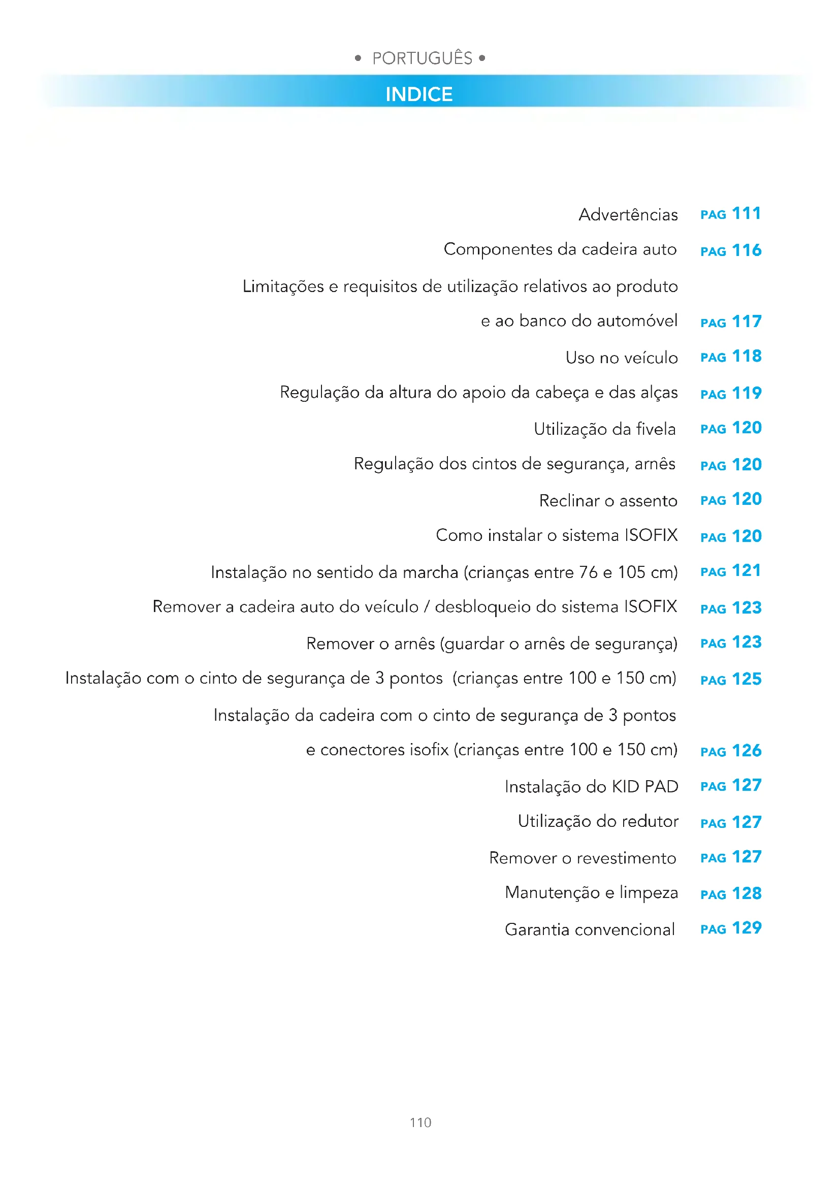 INDICE pag 111 pag 116 pag 117 pag 118 pag 119 pag 120 pag 120 pag 120 pag 120 pag 121 pag 123 pag 123 pag 125 pag 126 pag 127 pag 127 pag 127 pag 128 pag 129 Advertências Componentes da cadeira auto Limitações e requisitos de utilização relativos ao produto e ao banco do automóvel Uso no veículo Regulação da altura do apoio da cabeça e das alças Utilização da vela Regulação dos cintos de segurança, arnês Reclinar o assento Como instalar o sistema ISOFIX Instalação no sentido da marcha (crianças entre 76 e 105 cm) Remover a cadeira auto do veículo / desbloqueio do sistema ISOFIX Remover o arnês (guardar o arnês de segurança) Instalação com o cinto de segurança de 3 pontos (crianças entre 100 e 150 cm) Instalação da cadeira com o cinto de segurança de 3 pontos e conectores isox (crianças entre 100 e 150 cm) Instalação do KID PAD Utilização do redutor Remover o revestimento Manutenção e limpeza Garantia convencional• PORTUGUÊS •