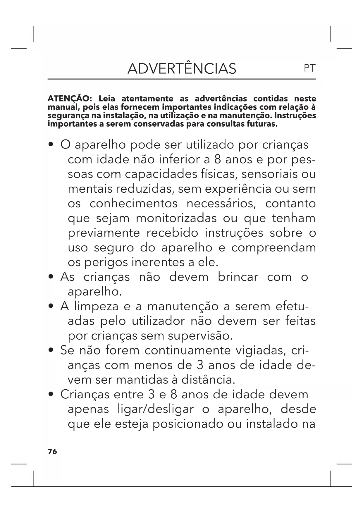 - Crianças entre 3 e 8 anos de idade não devem inserir a ficha, regular ou limpar o aparelho, nem fazer a manutenção aos cui- dados do utilizador.