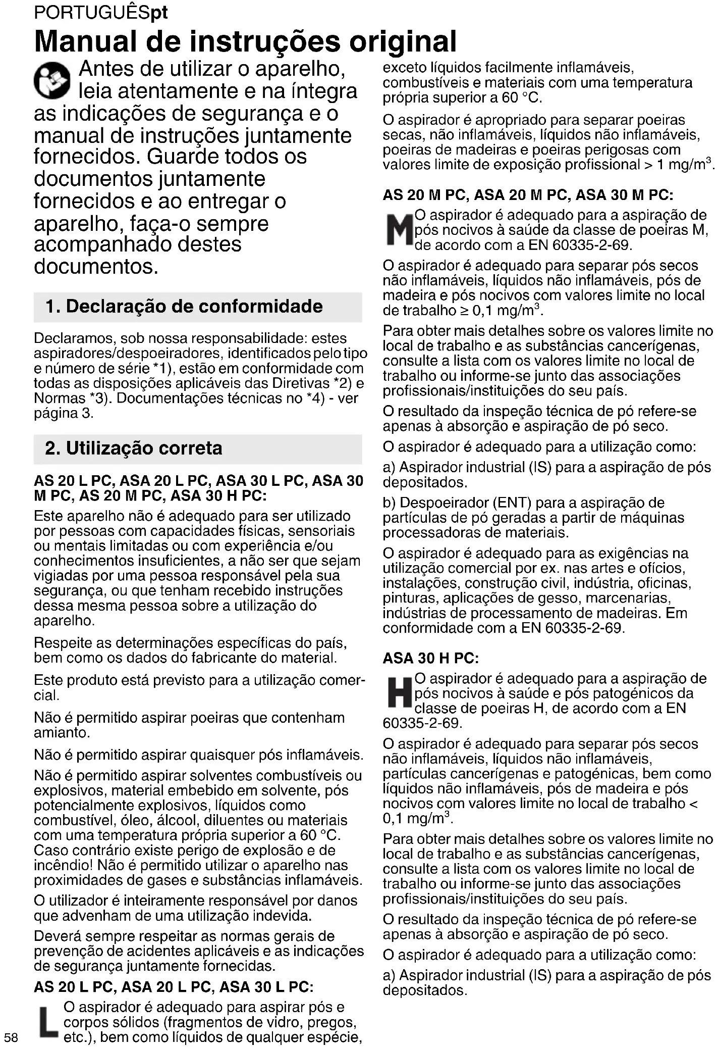 Manual de instruções original Antes de utilizar o aparelho, leia atentamente e na íntegra as indicações de segurança e o manual de instruções juntamente fornecidos. Guarde todos os documentos juntamente fornecidos e ao entregar o aparelho, faça-o sempre acompanhado destes documentos. Declaramos, sob nossa responsabilidade: estes aspiradores/despoeiradores, identificados pelo tipo e número de série *1), estão em conformidade com todas as disposições aplicáveis das Diretivas *2) e Normas *3). Documentações técnicas no *4) - ver página 3. AS 20 L PC, ASA 20 L PC, ASA 30 L PC, ASA 30 M PC, AS 20 M PC, ASA 30 H PC: Este aparelho não é adequado para ser utilizado por pessoas com capacidades físicas, sensoriais ou mentais limitadas ou com experiência e/ou conhecimentos insuficientes, a não ser que sejam vigiadas por uma pessoa responsável pela sua segurança, ou que tenham recebido instruções dessa mesma pessoa sobre a utilização do aparelho. Respeite as determinações específicas do país, bem como os dados do fabricante do material. Este produto está previsto para a utilização comer- cial. Não é permitido aspirar poeiras que contenham amianto. Não é permitido aspirar quaisquer pós inflamáveis. Não é permitido aspirar solventes combustíveis ou explosivos, material embebido em solvente, pós potencialmente explosivos, líquidos como combustível, óleo, álcool, diluentes ou materiais com uma temperatura própria superior a 60 °C. Caso contrário existe perigo de explosão e de incêndio! Não é permitido utilizar o aparelho nas proximidades de gases e substâncias inflamáveis. O utilizador é inteiramente responsável por danos que advenham de uma utilização indevida. Deverá sempre respeitar as normas gerais de prevenção de acidentes aplicáveis e as indicações de segurança juntamente fornecidas. AS 20 L PC, ASA 20 L PC, ASA 30 L PC: O aspirador é adequado para aspirar pós e corpos sólidos (fragmentos de vidro, pregos, etc.), bem como líquidos de qualquer espécie, exceto líquidos facilmente inflamáveis, combustíveis e materiais com uma temperatura própria superior a 60 °C. O aspirador é apropriado para separar poeiras secas, não inflamáveis, líquidos não inflamáveis, poeiras de madeiras e poeiras perigosas com valores limite de exposição profissional > 1 mg/m³. AS 20 M PC, ASA 20 M PC, ASA 30 M PC: O aspirador é adequado para a aspiração de pós nocivos à saúde da classe de poeiras M, de acordo com a EN 60335-2-69. O aspirador é adequado para separar pós secos não inflamáveis, líquidos não inflamáveis, pós de madeira e pós nocivos com valores limite no local de trabalho ≥ 0,1 mg/m³. Para obter mais detalhes sobre os valores limite no local de trabalho e as substâncias cancerígenas, consulte a lista com os valores limite no local de trabalho ou informe-se junto das associações profissionais/instituições do seu país. O resultado da inspeção técnica de pó refere-se apenas à absorção e aspiração de pó seco. O aspirador é adequado para a utilização como: a) Aspirador industrial (IS) para a aspiração de pós depositados. b) Despoeirador (ENT) para a aspiração de partículas de pó geradas a partir de máquinas processadoras de materiais. O aspirador é adequado para as exigências na utilização comercial por ex. nas artes e ofícios, instalações, construção civil, indústria, oficinas, pinturas, aplicações de gesso, marcenarias, indústrias de processamento de madeiras. Em conformidade com a EN 60335-2-69. ASA 30 H PC: O aspirador é adequado para a aspiração de pós nocivos à saúde e pós patogénicos da classe de poeiras H, de acordo com a EN 60335-2-69. O aspirador é adequado para separar pós secos não inflamáveis, líquidos não inflamáveis, partículas cancerígenas e patogénicas, bem como líquidos não inflamáveis, pós de madeira e pós nocivos com valores limite no local de trabalho < 0,1 mg/m³. Para obter mais detalhes sobre os valores limite no local de trabalho e as substâncias cancerígenas, consulte a lista com os valores limite no local de trabalho ou informe-se junto das associações profissionais/instituições do seu país. O resultado da inspeção técnica de pó refere-se apenas à absorção e aspiração de pó seco. O aspirador é adequado para a utilização como: a) Aspirador industrial (IS) para a aspiração de pós depositados.