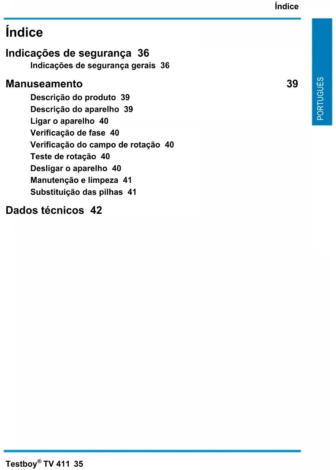 Índice Indicações de segurança 36 Indicações de segurança gerais 36 Manuseamento 39 Descrição do produto 39 Descrição do aparelho 39 Ligar o aparelho 40 Verificação de fase 40 Verificação do campo de rotação 40 Teste de rotação 40 Desligar o aparelho 40 Manutenção e limpeza 41 Substituição das pilhas 41 Dados técnicos 42Indicações de segurança 36 Testboy