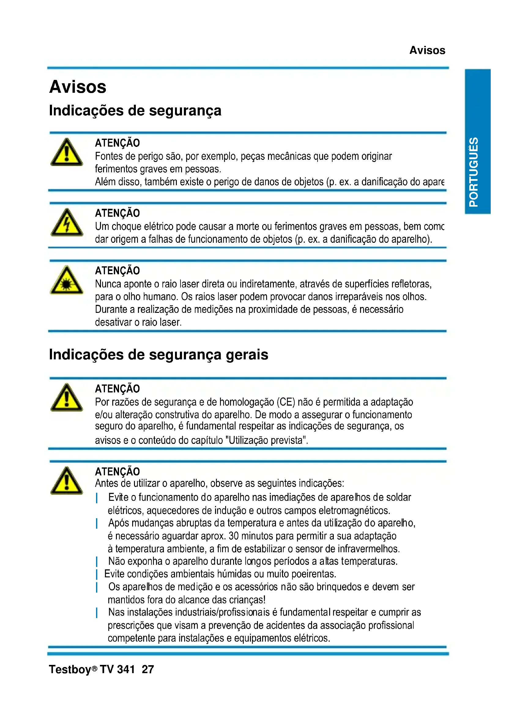 ATENÇÃO Antes de utilizar o aparelho, observe as seguintes indicações: | Evite o funcionamento do aparelho nas imediações de aparelhos de soldar elétricos, aquecedores de indução e outros campos eletromagnéticos. | Após mudanças abruptas da temperatura e antes da utilização do aparelho, é necessário aguardar aprox. 30 minutos para permitir a sua adaptação à temperatura ambiente, a fim de estabilizar o sensor de infravermelhos. | Não exponha o aparelho durante longos períodos a altas temperaturas. | Evite condições ambientais húmidas ou muito poeirentas. | Os aparelhos de medição e os acessórios não são brinquedos e devem ser mantidos fora do alcance das crianças! | Nas instalações industriais/profissionais é fundamental respeitar e cumprir as prescrições que visam a prevenção de acidentes da associação profissional competente para instalações e equipamentos elétricos.Avisos 28 Testboy