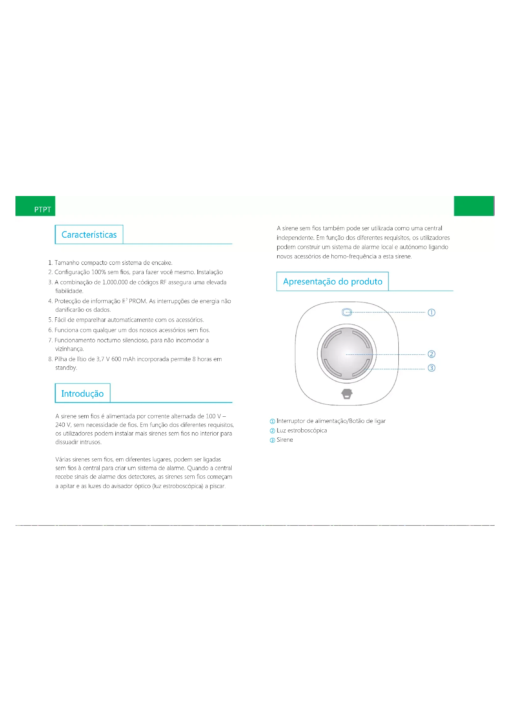 standby. Introdução A sirene sem os é alimentada por corrente alternada de 100 V – 240 V, sem necessidade de os. Em função dos diferentes requisitos, os utilizadores podem instalar mais sirenes sem os no interior para dissuadir intrusos. Várias sirenes sem os, em diferentes lugares, podem ser ligadas sem os à central para criar um sistema de alarme. Quando a central recebe sinais de alarme dos detectores, as sirenes sem os começam a apitar e as luzes do avisador óptico (luz estroboscópica) a piscar. A sirene sem os também pode ser utilizada como uma central independente. Em função dos diferentes requisitos, os utilizadores podem construir um sistema de alarme local e autónomo ligando novos acessórios de homo-frequência a esta sirene. Apresentação do produto