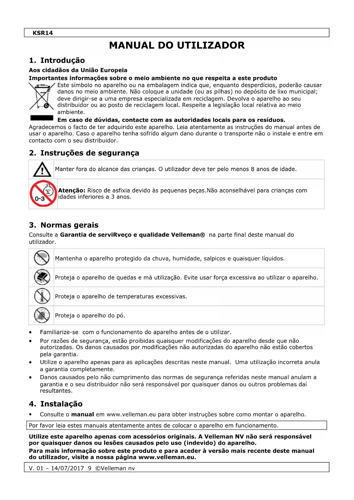 Consulte o manual em www.velleman.eu para obter instruções sobre como montar o aparelho. Por favor leia estes manuais atentamente antes de colocar o aparelho em funcionamento. Utilize este aparelho apenas com acessórios originais. A Velleman NV não será responsável por quaisquer danos ou lesões causados pelo uso (indevido) do aparelho. Para mais informação sobre este produto e para aceder à versão mais recente deste manual do utilizador, visite a nossa página www.velleman.eu.KSR14