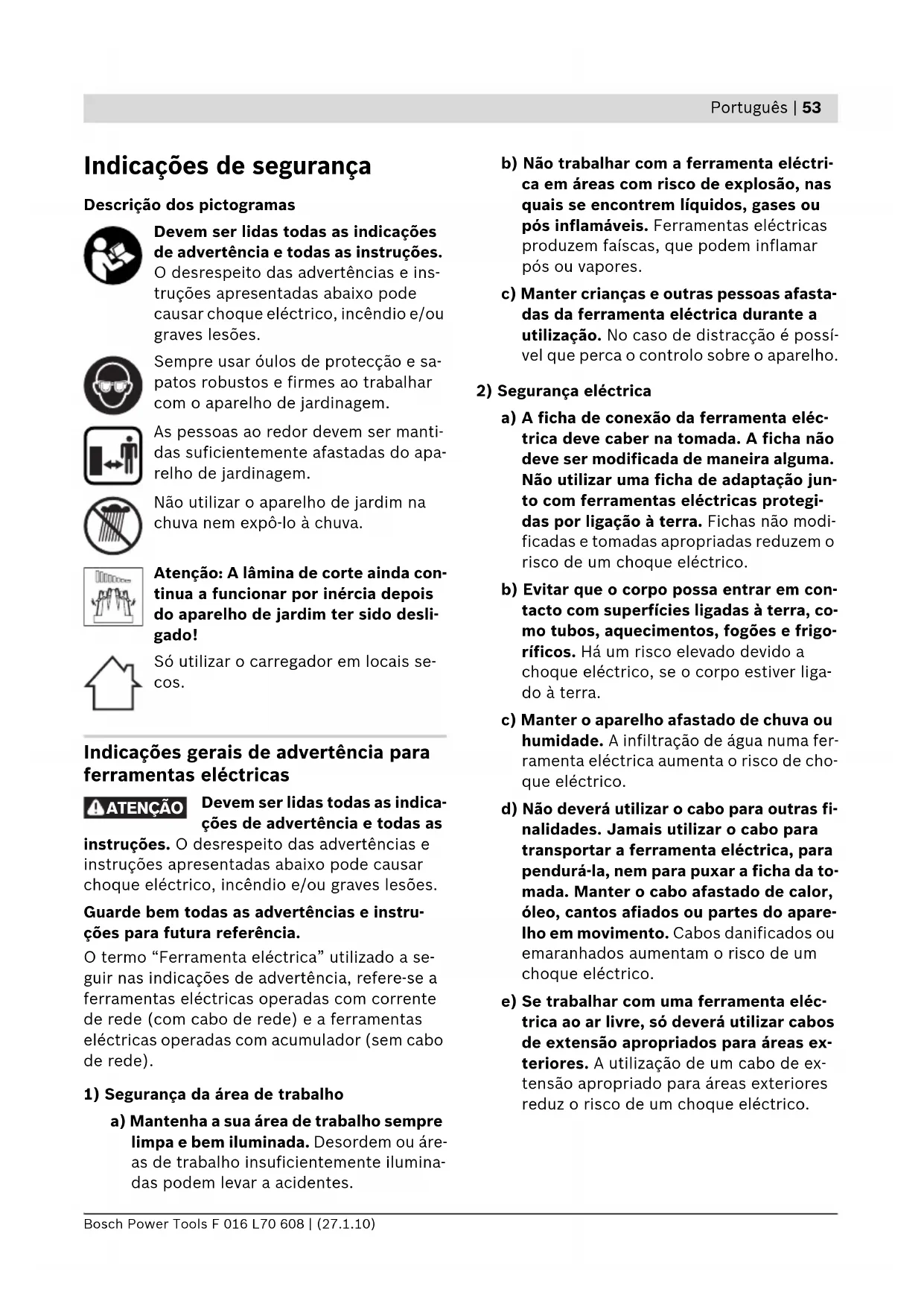 Indicações de segurança Descrição dos pictogramas Devem ser lidas todas as indicações de advertência e todas as instruções. O desrespeito das advertências e ins- truções apresentadas abaixo pode causar choque eléctrico, incêndio e/ou graves lesões. Sempre usar óulos de protecção e sa- patos robustos e firmes ao trabalhar com o aparelho de jardinagem. As pessoas ao redor devem ser manti- das suficientemente afastadas do apa- relho de jardinagem. Não utilizar o aparelho de jardim na chuva nem expô-lo à chuva. Atenção: A lâmina de corte ainda con- tinua a funcionar por inércia depois do aparelho de jardim ter sido desli- gado! Só utilizar o carregador em locais se- cos. Indicações gerais de advertência para ferramentas eléctricas Devem ser lidas todas as indica- ções de advertência e todas as instruções. O desrespeito das advertências e instruções apresentadas abaixo pode causar choque eléctrico, incêndio e/ou graves lesões. Guarde bem todas as advertências e instru- ções para futura referência. O termo “Ferramenta eléctrica” utilizado a se- guir nas indicações de advertência, refere-se a ferramentas eléctricas operadas com corrente de rede (com cabo de rede) e a ferramentas eléctricas operadas com acumulador (sem cabo de rede).