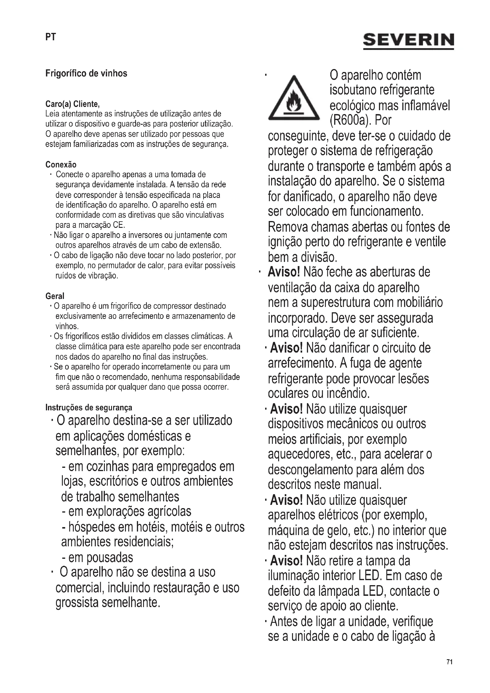 O aparelho contém isobutano refrigerante ecológico mas inamável (R600a). Por conseguinte, deve ter-se o cuidado de proteger o sistema de refrigeração durante o transporte e também após a instalação do aparelho. Se o sistema for danicado, o aparelho não deve ser colocado em funcionamento. Remova chamas abertas ou fontes de ignição perto do refrigerante e ventile bem a divisão. ∙ Aviso! Não feche as aberturas de ventilação da caixa do aparelho nem a superestrutura com mobiliário incorporado. Deve ser assegurada uma circulação de ar suciente. ∙ Aviso! Não danicar o circuito de arrefecimento. A fuga de agente refrigerante pode provocar lesões oculares ou incêndio. ∙ Aviso! Não utilize quaisquer dispositivos mecânicos ou outros meios articiais, por exemplo aquecedores, etc., para acelerar o descongelamento para além dos descritos neste manual. ∙ Aviso! Não utilize quaisquer aparelhos elétricos (por exemplo, máquina de gelo, etc.) no interior que não estejam descritos nas instruções. ∙ Aviso! Não retire a tampa da iluminação interior LED. Em caso de defeito da lâmpada LED, contacte o serviço de apoio ao cliente. ∙ Antes de ligar a unidade, verique se a unidade e o cabo de ligação à PT72 142 x 208 mm rede não caram danicados durante o transporte. Em caso de danos, o aparelho não deve ser colocado em funcionamento. ∙ Ao instalar o aparelho, certique-se de que o cabo de ligação à rede não ca trilhado nem danicado. ∙ As tomadas múltiplas portáteis ou unidades de alimentação não devem ser colocadas na parte de trás do aparelho. ∙ Não armazene neste aparelho substâncias explosivas, tais como contentores de aerossóis com gás propulsor inamável. ∙ Ao vender, entregar ou enviar para reciclagem, o ciclopentano propulsor no isolamento e o agente refrigerante R600a devem ser assinalados. Para mais informações sobre reciclagem adequada, consulte a secção “Eliminação”. ∙ Se forem necessárias reparações ou intervenções no aparelho, aquelas devem ser efetuadas por um serviço de assistência ao cliente autorizado, para cumprimento dos regulamentos de segurança e evitar riscos. Isto também se aplica à substituição do cabo de ligação. ∙ O aparelho pode ser utilizado por crianças com mais de 8 anos de idade ou por pessoas com capacidades físicas, sensoriais ou mentais reduzidas ou experiência e/ou conhecimentos insucientes, caso sejam supervisionadas ou caso tenham recebido instruções adequadas em relação ao uso seguro do aparelho, compreendendo os perigos associados. ∙ As crianças a partir dos 3 anos e com menos de 8 anos podem encher e esvaziar o aparelho. ∙ As crianças não devem brincar com o aparelho. ∙ A limpeza e a manutenção do utilizador não devem ser efetuadas por crianças sem supervisão. ∙ Para cuidados regulares, é adequada água morna com uma adição de líquido de lavagem. Para mais informações sobre limpeza, consultar a secção “Limpeza e cuidados”. ∙ Por razões de segurança elétrica, o aparelho não deve ser limpo com líquidos nem neles imerso. ∙ Aviso! Não retire a tampa da iluminação interior LED. Em caso de defeito da lâmpada LED, contacte o serviço de apoio ao cliente. Para evitar a contaminação dos alimentos, devem ser observadas as seguintes instruções: ∙ Se a porta for aberta durante muito tempo, a temperatura nos compartimentos do aparelho pode subir consideravelmente. Certique- se de que a porta está devidamente fechada e não bloqueada por garrafas de vinho. ∙ Limpar regularmente as superfícies que possam entrar em contacto com alimentos e sistemas de drenagem acessíveis. ∙ Se o aparelho for deixado vazio73 142 x 208 mm durante muito tempo, desligue-o, limpe-o e deixe a porta aberta para evitar o crescimento de bolor. ∙ Armazenar apenas vinho no aparelho. ∙ Para evitar ferimentos pessoais e danos materiais, transportar a unidade apenas embalada e montá-la com duas pessoas. ∙ Só transportar o aparelho, por curtas distâncias, sobre os rodízios que se encontram na parte de baixo do mesmo. ∙ Atenção! Mantenha as crianças afastadas de materiais de embalagem. Existe o perigo de asxia! ∙ Vericar regularmente se o cabo de ligação está danicado. Em caso de danos, o aparelho não deve ser mais utilizado. ∙ Não utilize aparelhos elétricos na superfície de armazenamento para evitar riscos de incêndio. Além disso, não coloque quaisquer recipientes de líquidos sobre o aparelho para que eventuais fugas de líquidos não afetem o isolamento elétrico. ∙ Não cobrir, modicar ou remover as prateleiras de madeira com função de puxar. Deve ser sempre assegurada a circulação de ar no interior. ∙ Não utilizar prateleiras, compartimentos, porta, etc. como superfície de degrau ou para apoio. ∙ Para evitar que o aparelho tombe, nunca puxe simultaneamente para fora várias prateleiras de madeira. ∙ Não manusear chamas nuas ou fontes de ignição no interior do aparelho. ∙ Não deixe o cabo eléctrico pendurado. - no caso de ocorrer alguma avaria durante a operação, - antes de cada limpeza, - quando se trabalha com o aparelho. ∙ Não retirar a cha da tomada puxando pelo cabo de ligação; agarre a cha para a retirar da tomada. ∙ Reservamo-nos o direito de fazer alterações técnicas. Estrutura
