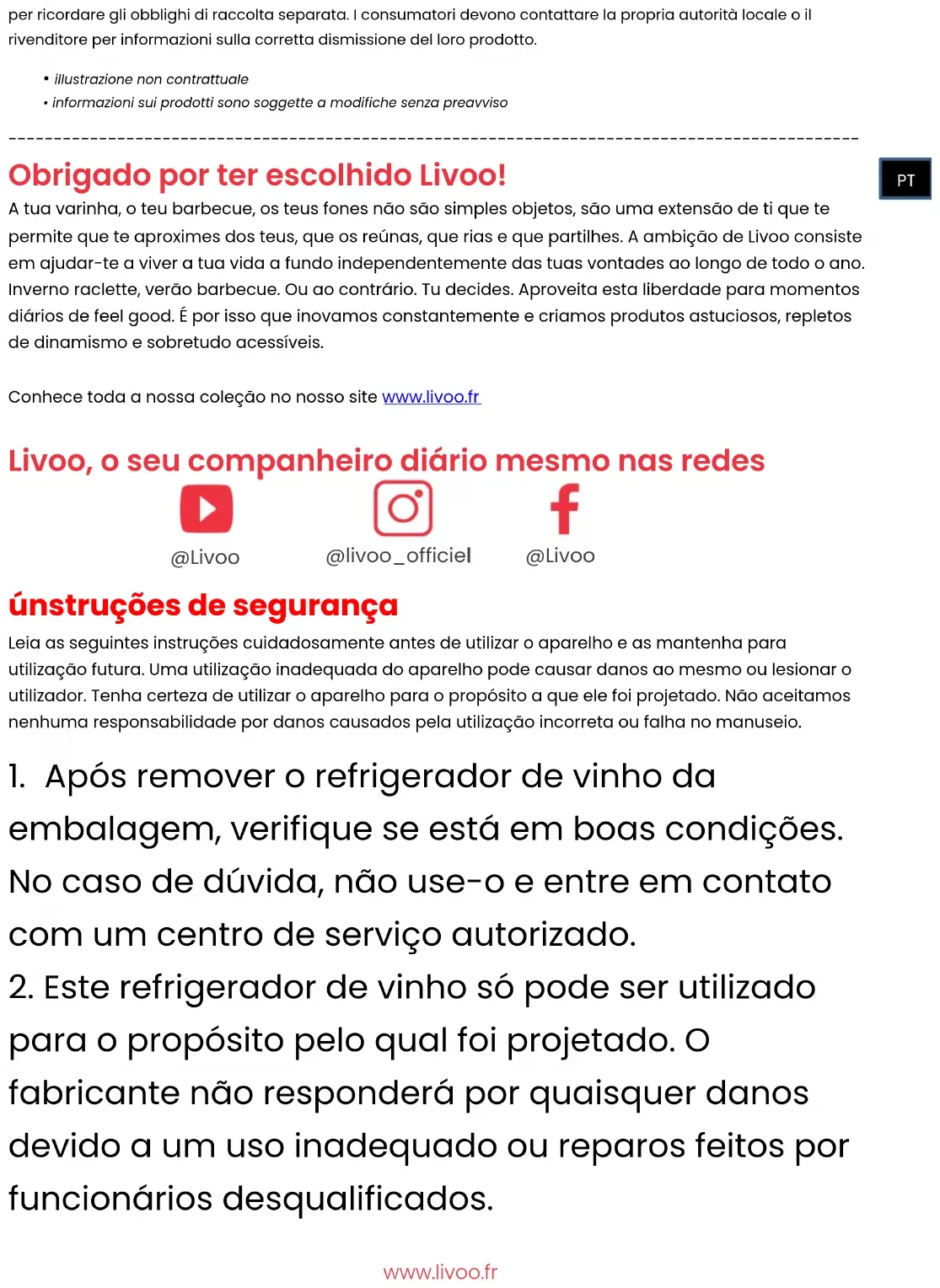 Obrigado por ter escolhido Livoo! A tua varinha, o teu barbecue, os teus fones não são simples objetos, são uma extensão de ti que te permite que te aproximes dos teus, que os reúnas, que rias e que partilhes. A ambição de Livoo consiste em ajudar-te a viver a tua vida a fundo independentemente das tuas vontades ao longo de todo o ano. Inverno raclette, verão barbecue. Ou ao contrário. Tu decides. Aproveita esta liberdade para momentos diários de feel good. É por isso que inovamos constantemente e criamos produtos astuciosos, repletos de dinamismo e sobretudo acessíveis. Conhece toda a nossa coleção no nosso site www.livoo.fr Livoo, o seu companheiro diário mesmo nas redes