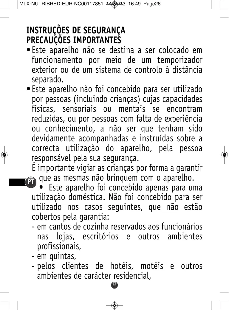 INSTRUÇÕES DE SEGURANÇA PRECAUÇÕES IMPORTANTES • Este aparelho não se destina a ser colocado em funcionamento por meio de um temporizador exterior ou de um sistema de controlo à distância separado. • Este aparelho não foi concebido para ser utilizado por pessoas (incluindo crianças) cujas capacidades físicas, sensoriais ou mentais se encontram reduzidas, ou por pessoas com falta de experiência ou conhecimento, a não ser que tenham sido devidamente acompanhadas e instruídas sobre a correcta utilização do aparelho, pela pessoa responsável pela sua segurança. É importante vigiar as crianças por forma a garantir PT que as mesmas não brinquem com o aparelho. • Este aparelho foi concebido apenas para uma utilização doméstica. Não foi concebido para ser utilizado nos casos seguintes, que não estão cobertos pela garantia: - em cantos de cozinha reservados aos funcionários nas lojas, escritórios e outros ambientes profissionais, - em quintas, - pelos clientes de hotéis, motéis e outros ambientes de carácter residencial, 26