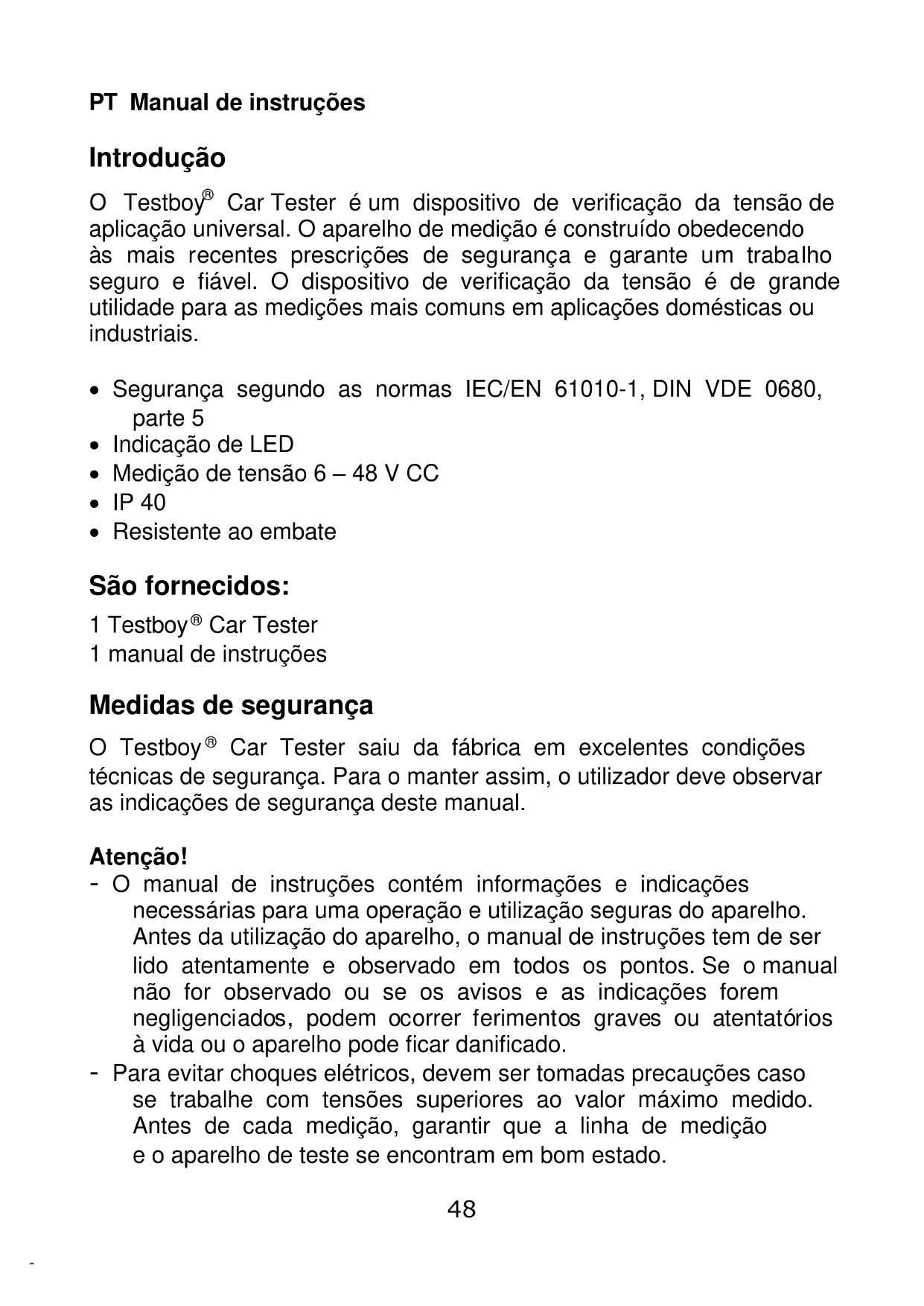 Car Tester 1 manual de instruções Medidas de segurança O Testboy