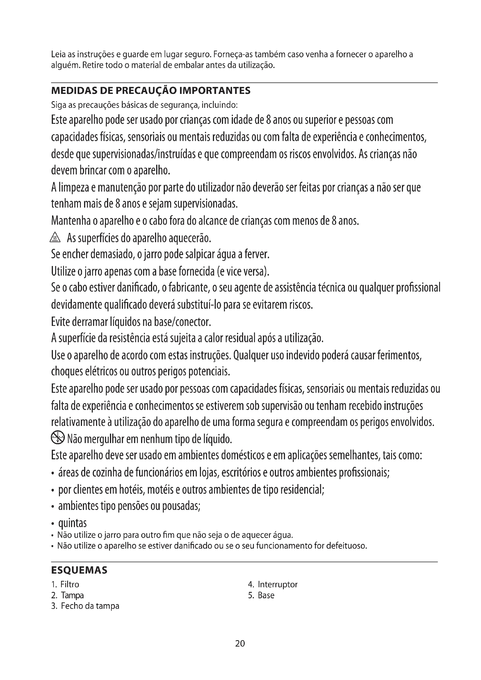 Siga as precauções básicas de segurança, incluindo: Este aparelho pode ser usado por crianças com idade de 8 anos ou superior e pessoas com capacidades físicas, sensoriais ou mentais reduzidas ou com falta de experiência e conhecimentos, desde que supervisionadas/instruídas e que compreendam os riscos envolvidos. As crianças não devem brincar com o aparelho. A limpeza e manutenção por parte do utilizador não deverão ser feitas por crianças a não ser que tenham mais de 8 anos e sejam supervisionadas. Mantenha o aparelho e o cabo fora do alcance de crianças com menos de 8 anos. h As superfícies do aparelho aquecerão. Se encher demasiado, o jarro pode salpicar água a ferver. Utilize o jarro apenas com a base fornecida (e vice versa). Se o cabo estiver danificado, o fabricante, o seu agente de assistência técnica ou qualquer profissional devidamente qualificado deverá substituí-lo para se evitarem riscos. Evite derramar líquidos na base/conector. A superfície da resistência está sujeita a calor residual após a utilização. Use o aparelho de acordo com estas instruções. Qualquer uso indevido poderá causar ferimentos, choques elétricos ou outros perigos potenciais. Este aparelho pode ser usado por pessoas com capacidades físicas, sensoriais ou mentais reduzidas ou falta de experiência e conhecimentos se estiverem sob supervisão ou tenham recebido instruções relativamente à utilização do aparelho de uma forma segura e compreendam os perigos envolvidos.