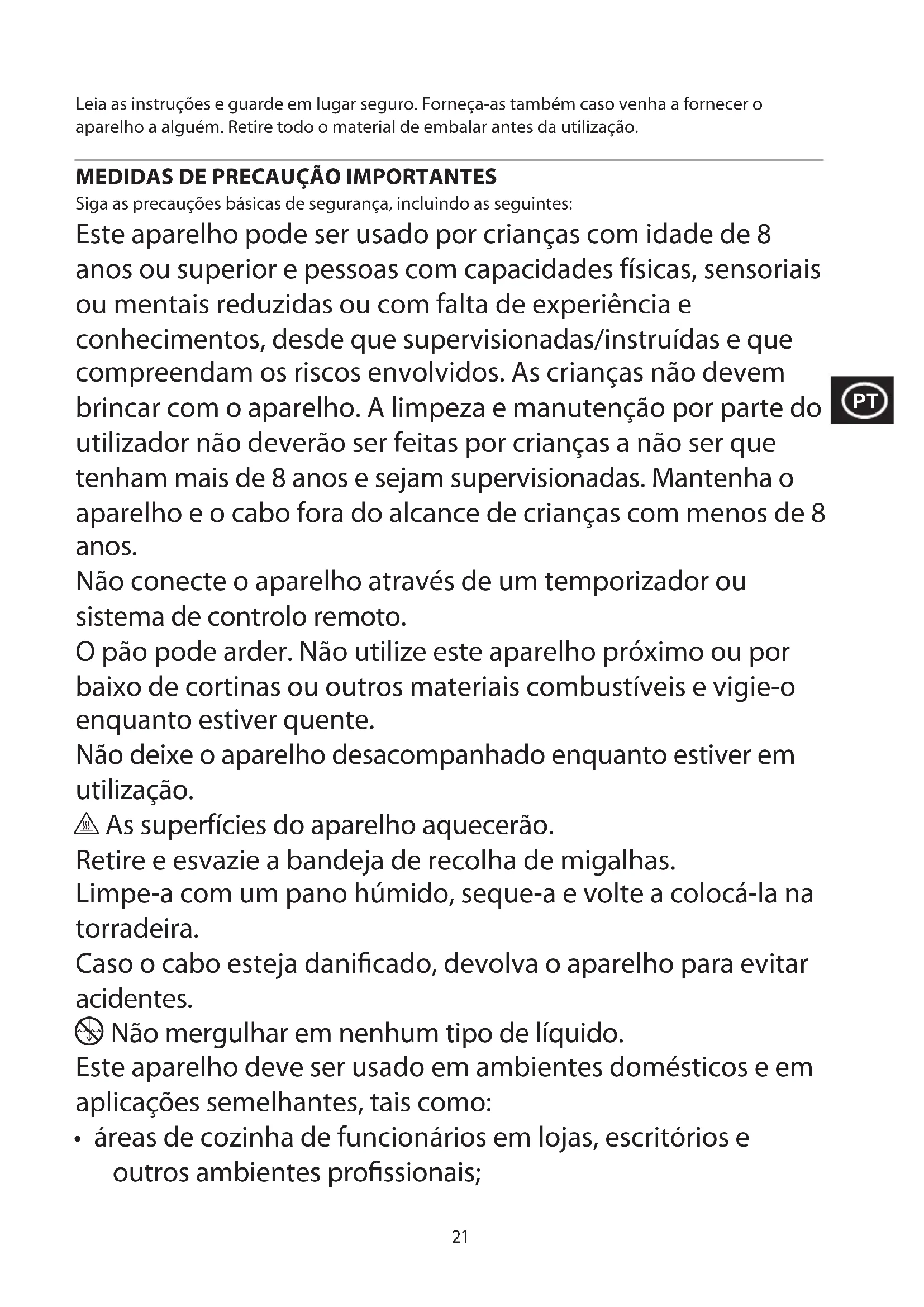 Siga as precauções básicas de segurança, incluindo as seguintes: Este aparelho pode ser usado por crianças com idade de 8 anos ou superior e pessoas com capacidades físicas, sensoriais ou mentais reduzidas ou com falta de experiência e conhecimentos, desde que supervisionadas/instruídas e que compreendam os riscos envolvidos. As crianças não devem brincar com o aparelho. A limpeza e manutenção por parte do utilizador não deverão ser feitas por crianças a não ser que tenham mais de 8 anos e sejam supervisionadas. Mantenha o aparelho e o cabo fora do alcance de crianças com menos de 8 anos. Não conecte o aparelho através de um temporizador ou sistema de controlo remoto. O pão pode arder. Não utilize este aparelho próximo ou por baixo de cortinas ou outros materiais combustíveis e vigie-o enquanto estiver quente. Não deixe o aparelho desacompanhado enquanto estiver em utilização. h As superfícies do aparelho aquecerão. Retire e esvazie a bandeja de recolha de migalhas. Limpe-a com um pano húmido, seque-a e volte a colocá-la na torradeira. Caso o cabo esteja danificado, devolva o aparelho para evitar acidentes. i Não mergulhar em nenhum tipo de líquido. Este aparelho deve ser usado em ambientes domésticos e em aplicações semelhantes, tais como: