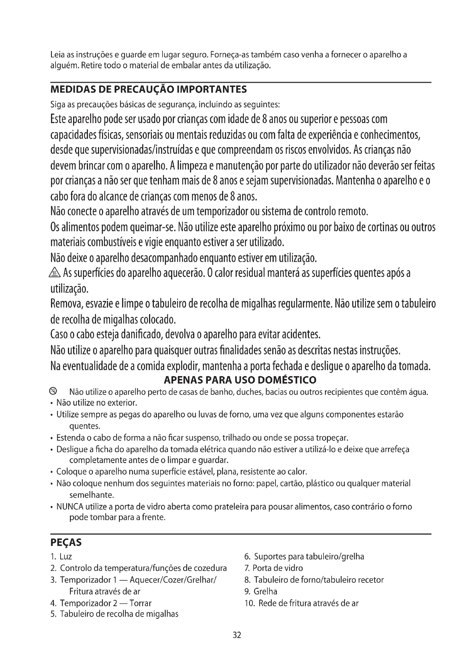 Siga as precauções básicas de segurança, incluindo as seguintes: Este aparelho pode ser usado por crianças com idade de 8 anos ou superior e pessoas com capacidades físicas, sensoriais ou mentais reduzidas ou com falta de experiência e conhecimentos, desde que supervisionadas/instruídas e que compreendam os riscos envolvidos. As crianças não devem brincar com o aparelho. A limpeza e manutenção por parte do utilizador não deverão ser feitas por crianças a não ser que tenham mais de 8 anos e sejam supervisionadas. Mantenha o aparelho e o cabo fora do alcance de crianças com menos de 8 anos. Não conecte o aparelho através de um temporizador ou sistema de controlo remoto. Os alimentos podem queimar-se. Não utilize este aparelho próximo ou por baixo de cortinas ou outros materiais combustíveis e vigie enquanto estiver a ser utilizado. Não deixe o aparelho desacompanhado enquanto estiver em utilização.