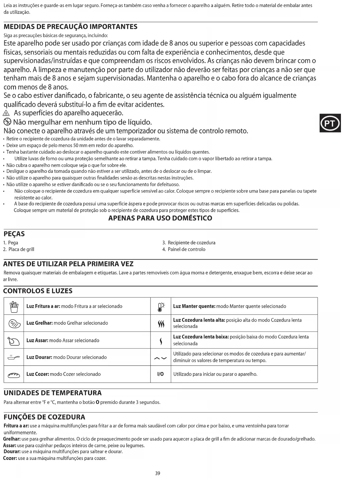 As superfícies do aparelho aquecerão. i Não mergulhar em nenhum tipo de líquido. Não conecte o aparelho através de um temporizador ou sistema de controlo remoto.