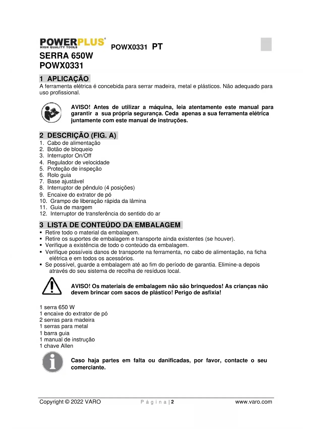 Copyright © 2022 VARO P á g i n a | 2 www.varo.com SERRA 650W POWX0331 1 APLICAÇÃO A ferramenta elétrica é concebida para serrar madeira, metal e plásticos. Não adequado para uso profissional. AVISO! Antes de utilizar a máquina, leia atentamente este manual para garantir a sua própria segurança. Ceda apenas a sua ferramenta elétrica juntamente com este manual de instruções. 2 DESCRIÇÃO (FIG. A)