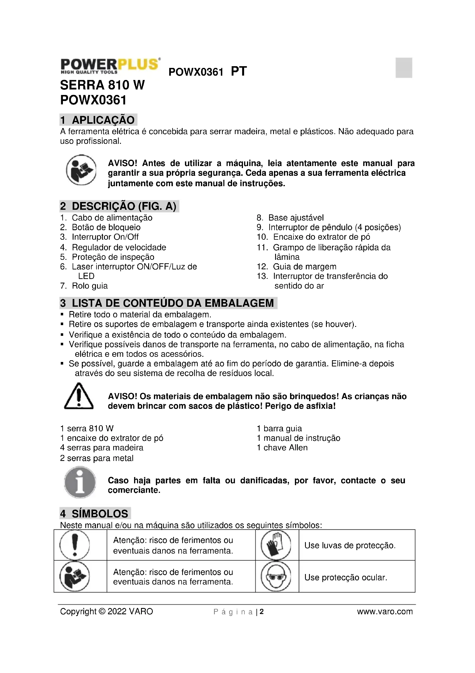 Copyright © 2022 VARO P á g i n a | 2 www.varo.com SERRA 810 W POWX0361 1 APLICAÇÃO A ferramenta elétrica é concebida para serrar madeira, metal e plásticos. Não adequado para uso profissional. AVISO! Antes de utilizar a máquina, leia atentamente este manual para garantir a sua própria segurança. Ceda apenas a sua ferramenta eléctrica juntamente com este manual de instruções. 2 DESCRIÇÃO (FIG. A)