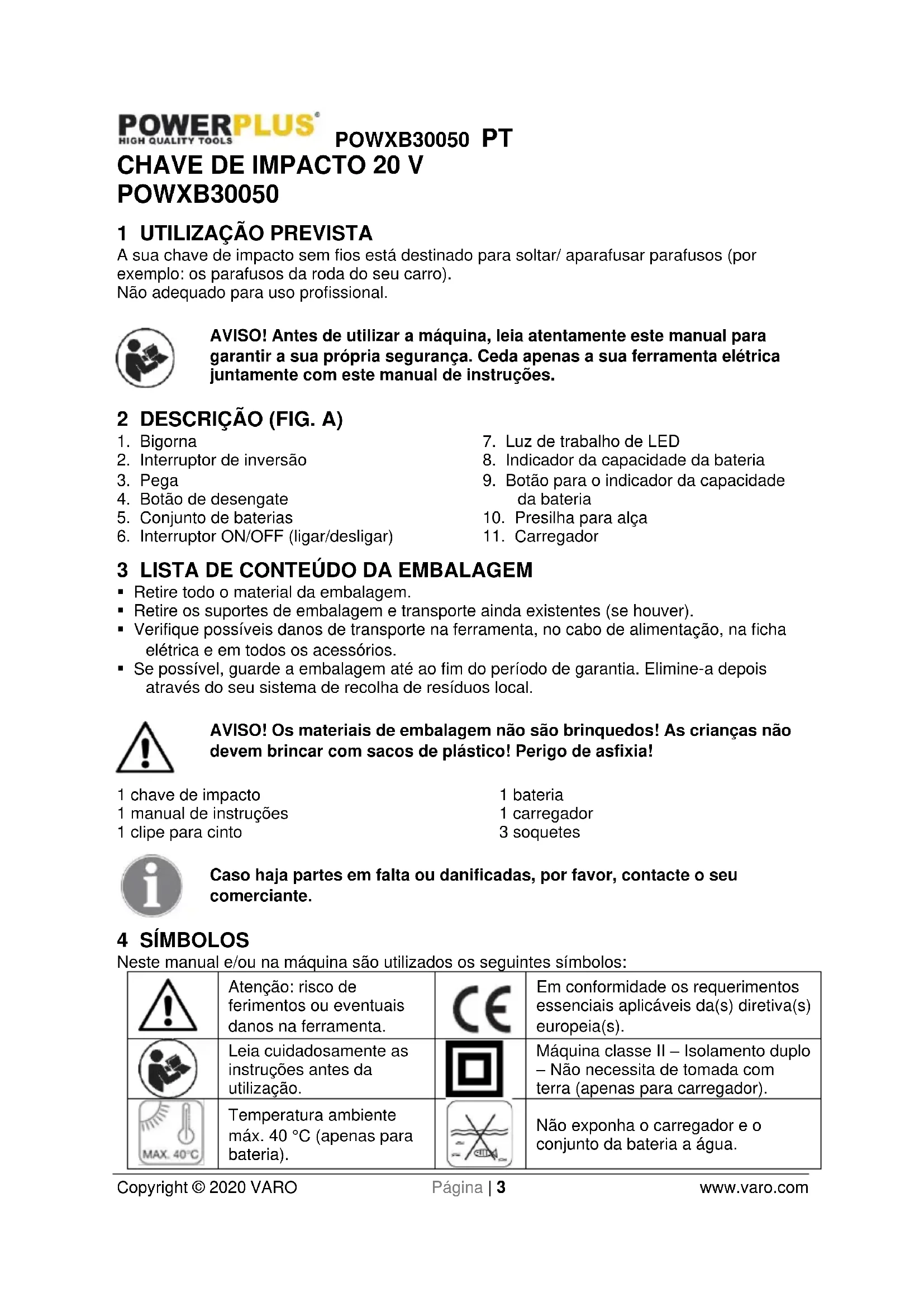 Não exponha o carregador e o conjunto da bateria a água.POWXB30050 PT Copyright © 2020 VARO Página | 4 www.varo.com