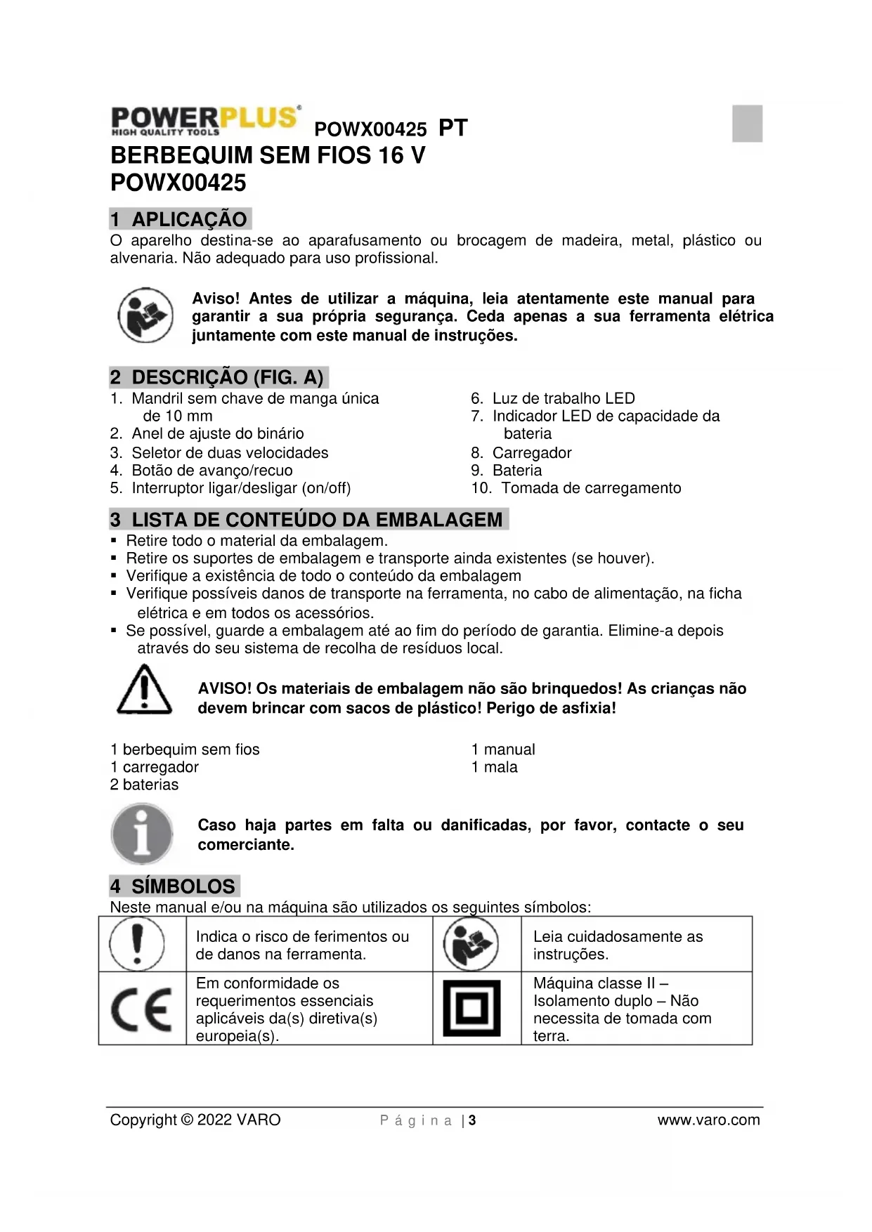 Máquina classe II – Isolamento duplo – Não necessita de tomada com terra.POWX00425 PT Copyright © 2022 VARO P á g i n a | 4 www.varo.com
