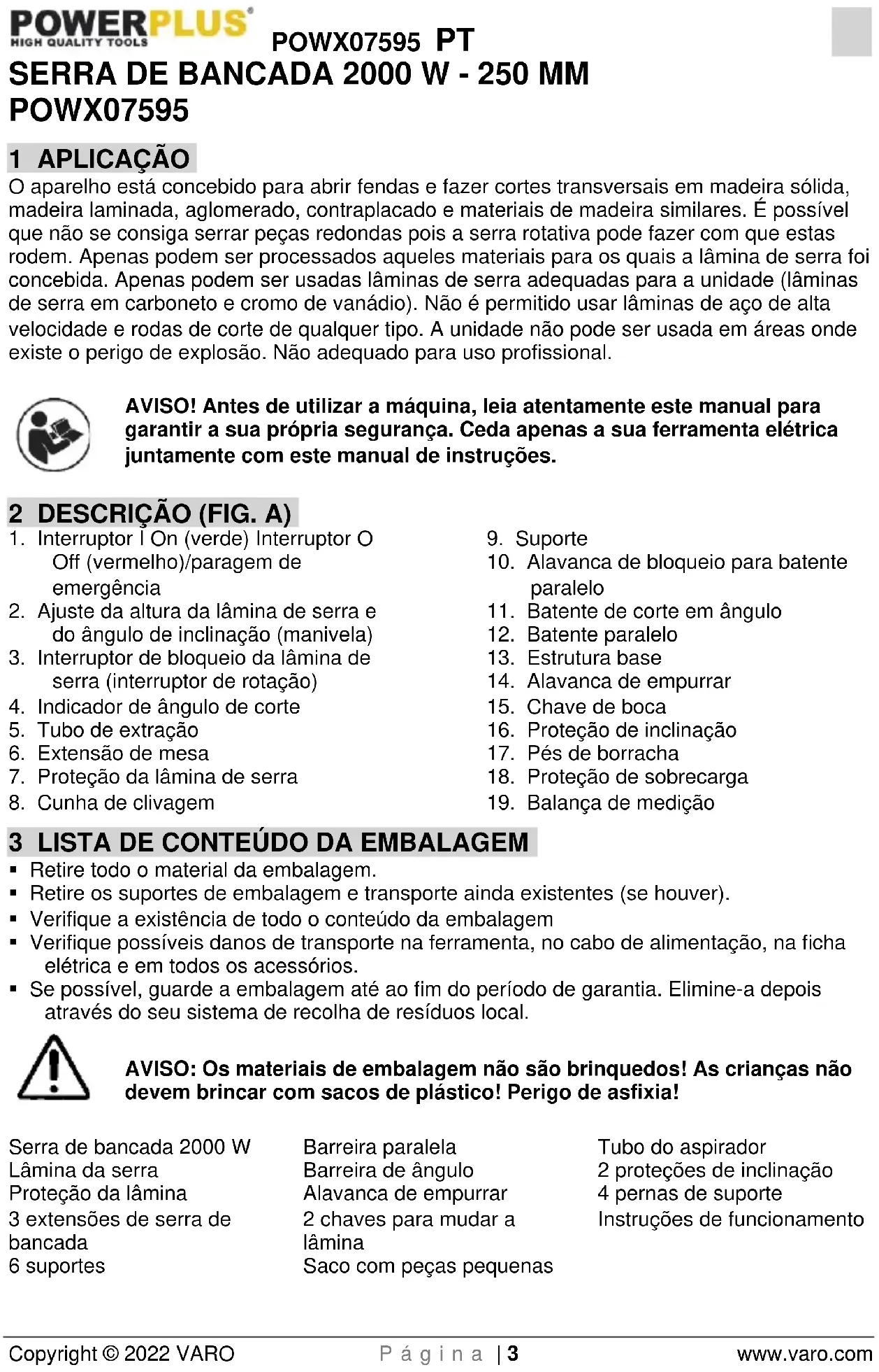 - Se possível, guarde a embalagem até ao fim do período de garantia. Elimine-a depois através do seu sistema de recolha de resíduos local. AVISO: Os materiais de embalagem não são brinquedos! As crianças não devem brincar com sacos de plástico! Perigo de asfixia! Serra de bancada 2000 W Lâmina da serra Proteção da lâmina 3 extensões de serra de bancada 6 suportes Barreira paralela Barreira de ângulo Alavanca de empurrar 2 chaves para mudar a lâmina Saco com peças pequenas Tubo do aspirador 2 proteções de inclinação 4 pernas de suporte Instruções de funcionamentoPOWX07595 PT Copyright © 2022 VARO P á g i n a | 4 www.varo.com Caso haja partes em falta ou danificadas, por favor, contacte o seu comerciante.