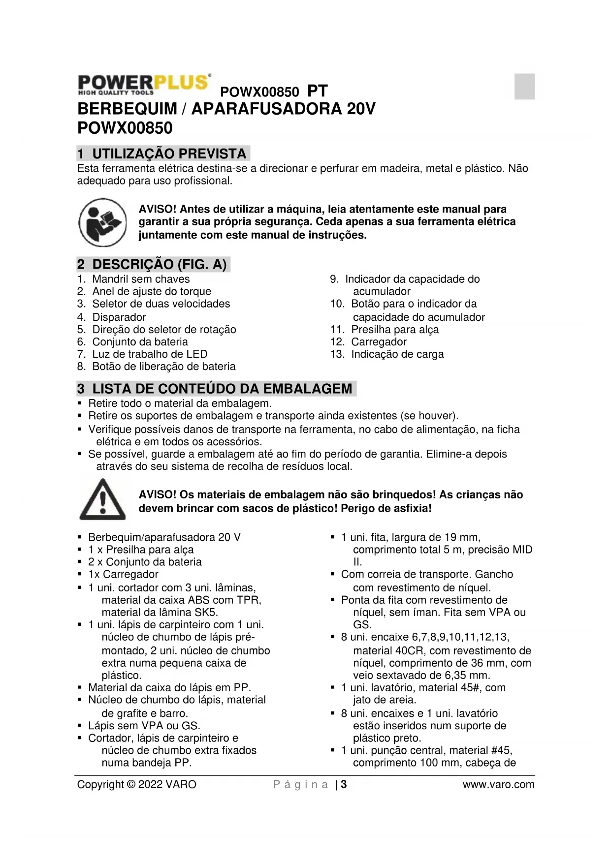 9.10 Direção da rotação (Fig. A) ................................................................................. 11POWX00850 PT Copyright © 2022 VARO P á g i n a | 2 www.varo.com